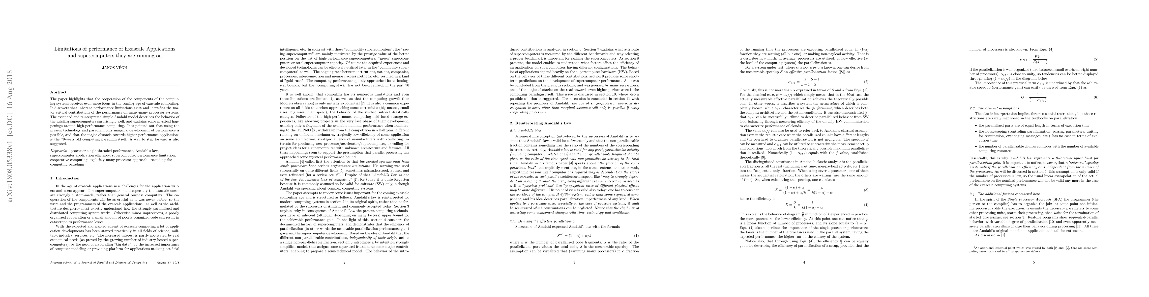The paper highlights that the cooperation of the components of the computing systems receives even more focus in the coming age of exascale computing. It discovers that inherent performance limitations exist and identifies the major critical contributions of the performance on many-many processor systems. The extended and reinterpreted simple Amdahl model describes the behavior of the existing supercomputers surprisingly well, and explains some mystical happenings around high-performance computing. It is pointed out that using the present technology and paradigm only marginal development of performance is possible, and that the major obstacle towards higher performance applications is the 70-years old computing paradigm itself. A way to step forward is also suggested