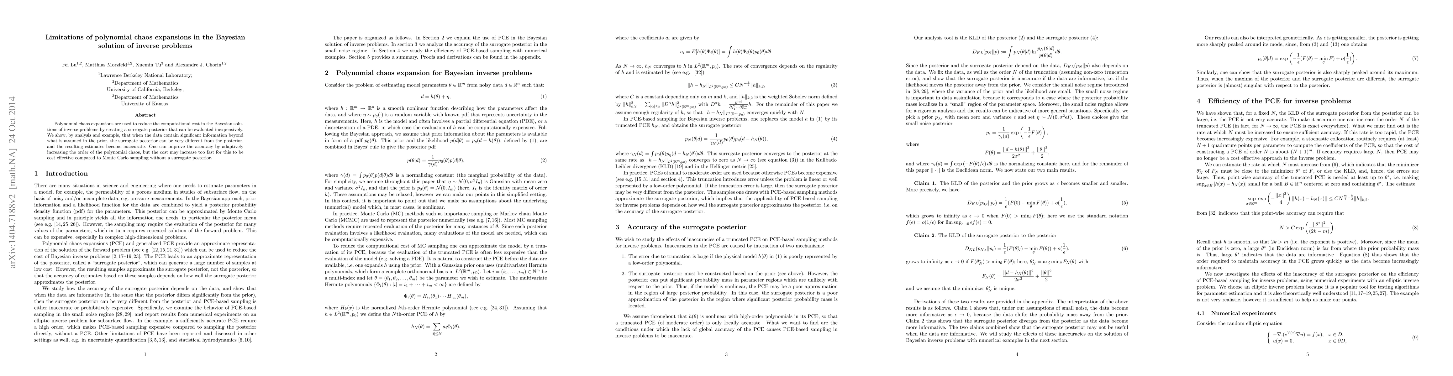 Polynomial chaos expansions are used to reduce the computational cost in the Bayesian solutions of inverse problems by creating a surrogate posterior that can be evaluated inexpensively. We show, by analysis and example, that when the data contain significant information beyond what is assumed in the prior, the surrogate posterior can be very different from the posterior, and the resulting estimates become inaccurate. One can improve the accuracy by adaptively increasing the order of the polynomial chaos, but the cost may increase too fast for this to be cost effective compared to Monte Carlo sampling without a surrogate posterior.