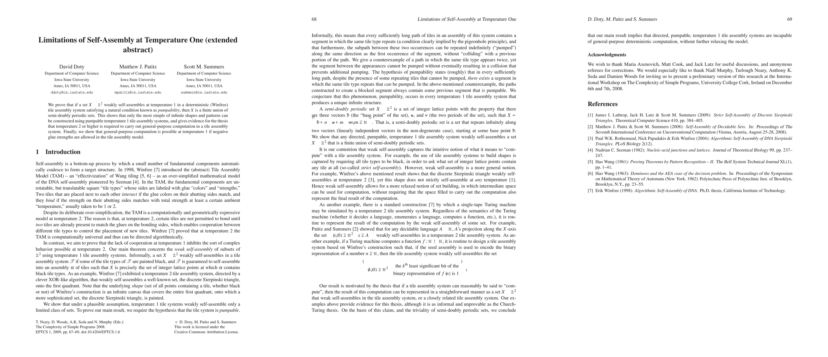 This paper demonstrates that temperature 1 tile assembly systems with pumpability can only self-assemble finite unions of doubly periodic sets, indicating limited complexity. It suggests that higher temperatures are necessary for general-purpose computation in such systems.