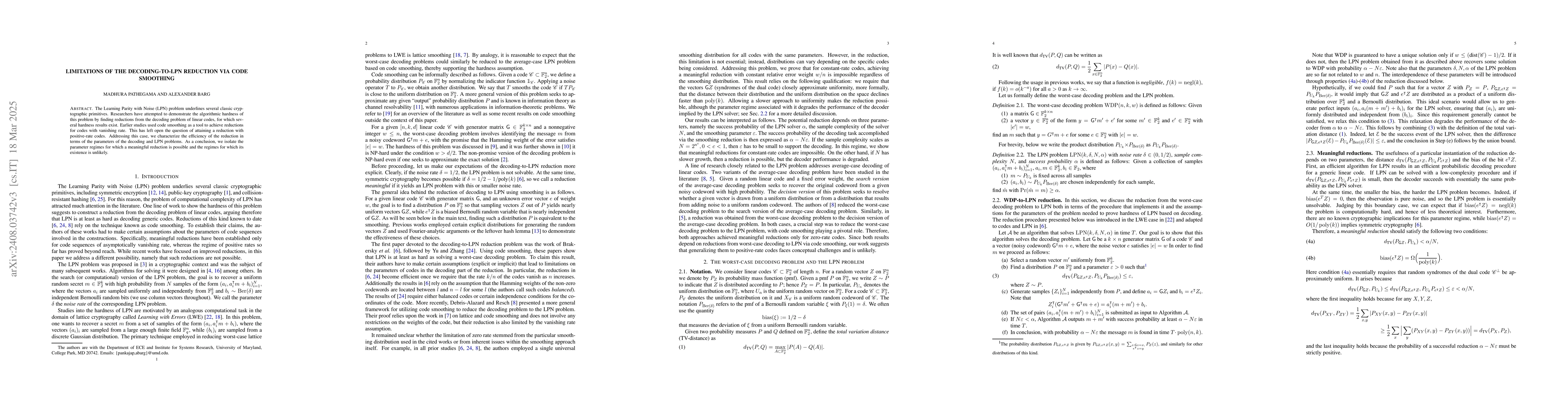 This research investigates the feasibility of reducing the Learning Parity with Noise (LPN) problem via code smoothing from linear code decoding, particularly focusing on codes with positive rates. It concludes that while reductions are possible under certain conditions, they are unlikely for specific parameter regimes.