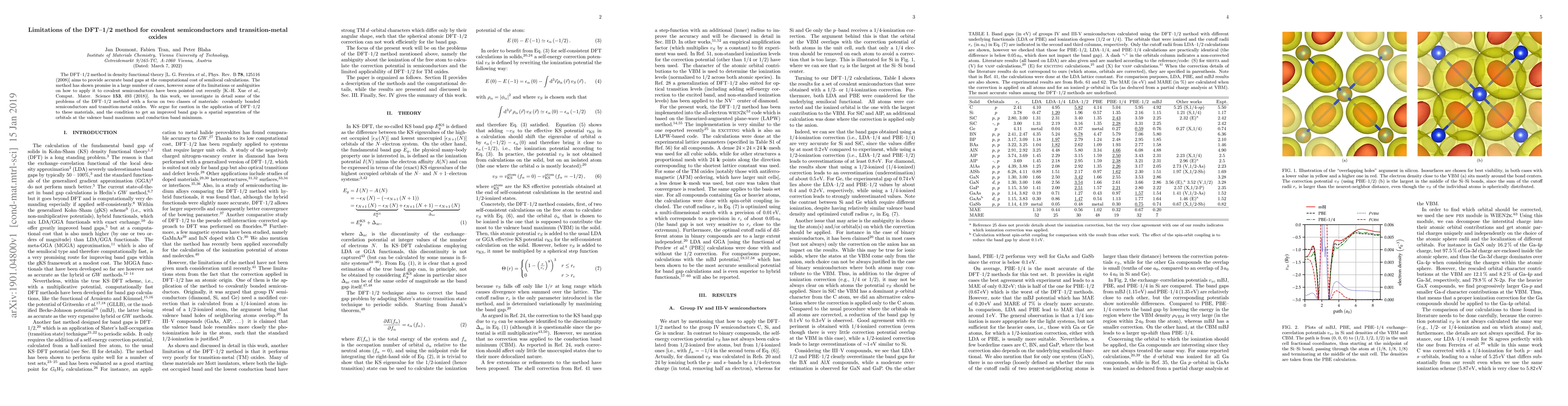 This paper examines the limitations of the DFT-1/2 method in density functional theory for accurately predicting band gaps in covalent semiconductors and transition-metal oxides. It highlights the need for spatial separation of orbitals at the valence and conduction band edges for improved results.