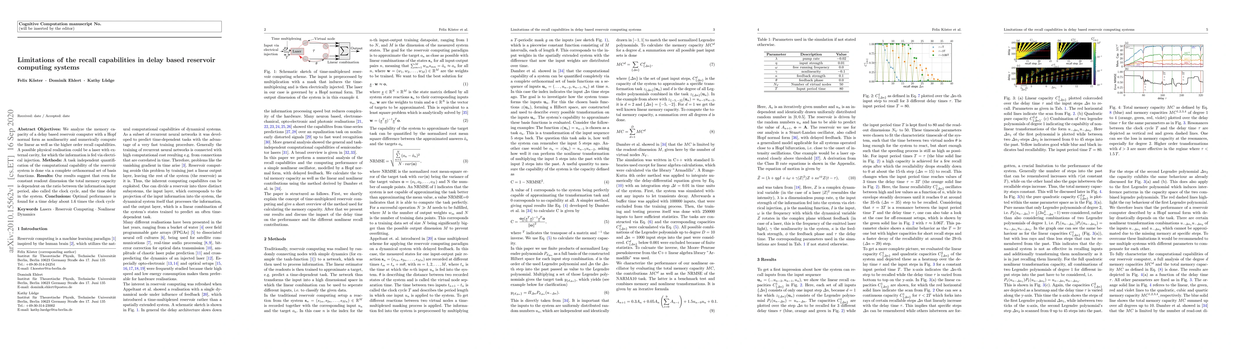 This research investigates the memory capacity of a delay-based reservoir computer using a Hopf normal form nonlinearity. Numerical computations reveal that recall capability depends on the ratio of the clock cycle to the time delay. Optimal performance is achieved with a time delay approximately 1.6 times the clock cycle, suggesting a crucial relationship between these parameters in such systems.