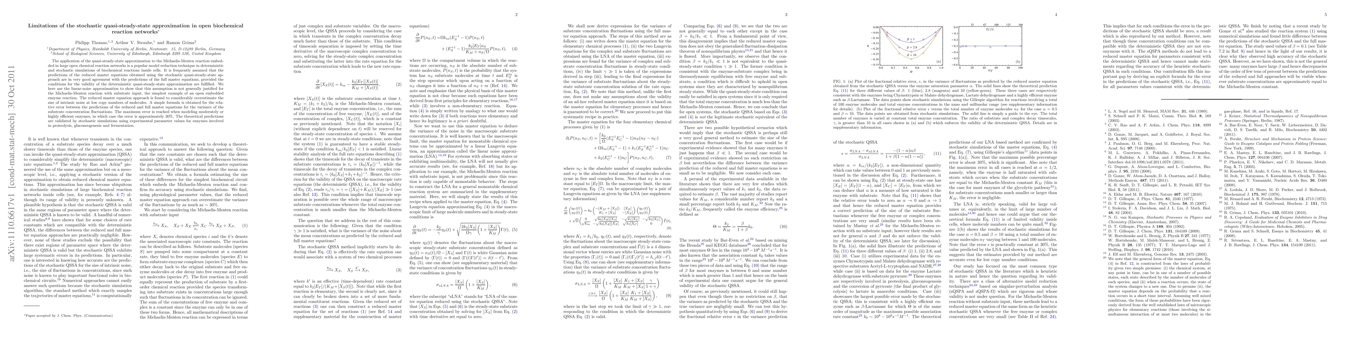 This paper identifies significant limitations of the stochastic quasi-steady-state approximation in open biochemical networks, demonstrating that it overestimates intrinsic noise, especially for low copy numbers and moderately to highly efficient enzymes, with errors up to 30%. The findings are validated through stochastic simulations using experimental enzyme data.