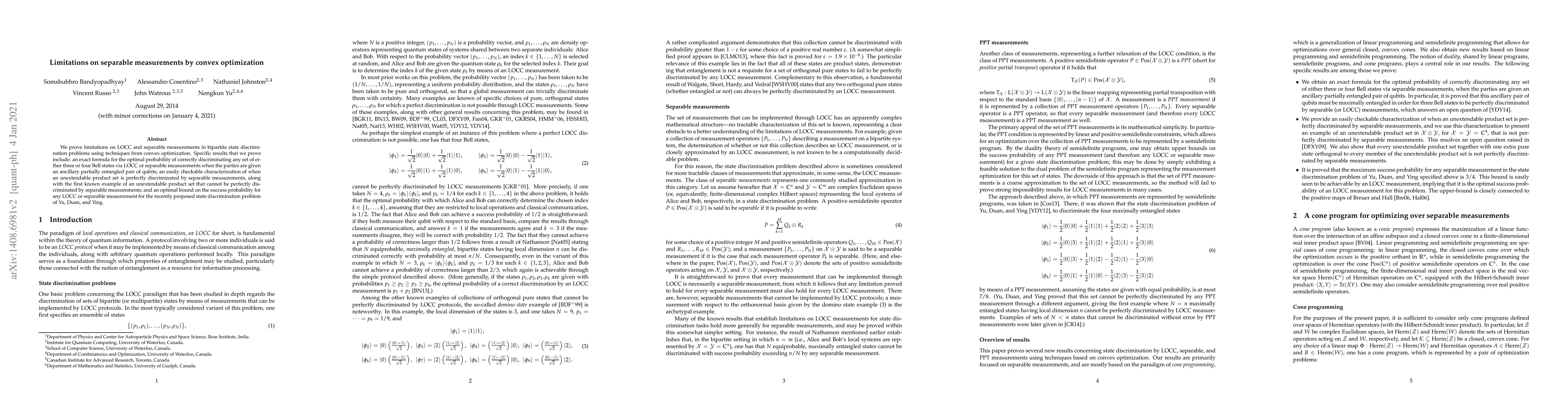Researchers prove limitations on separable measurements for state discrimination problems, including optimal probabilities for discriminating Bell states and bounds on success probability for a new problem, using techniques from convex optimization.