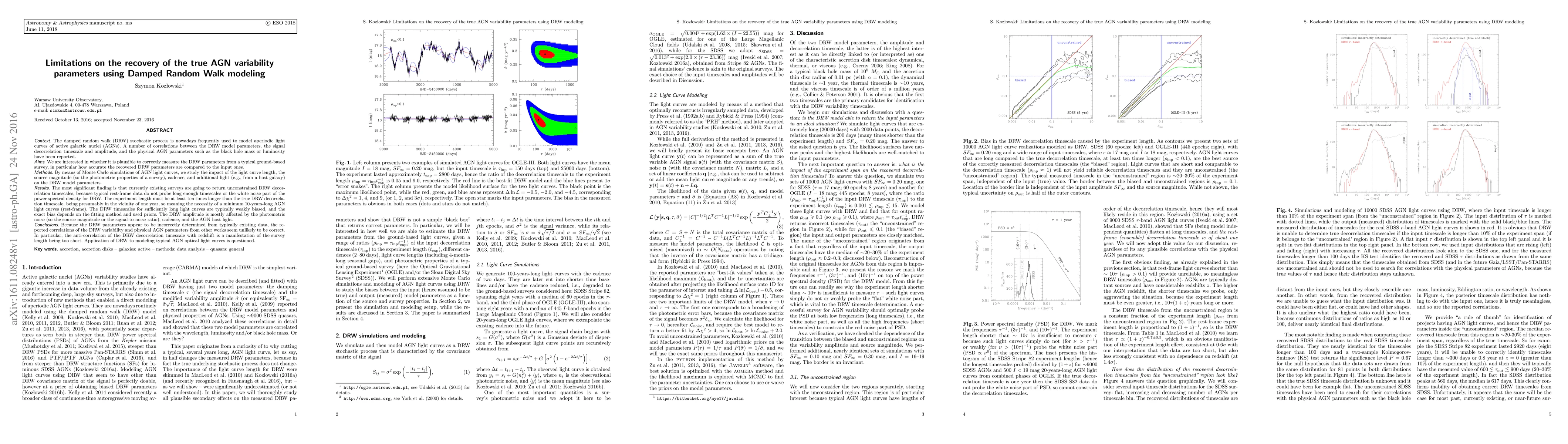Context: The damped random walk (DRW) stochastic process is nowadays frequently used to model aperiodic light curves of AGNs. A number of correlations between the DRW model parameters, the signal decorrelation timescale and amplitude, and the physical AGN parameters such as the black hole mass or luminosity have been reported. Aims: We are interested in whether it is plausible to correctly measure the DRW parameters from a typical ground-based survey, in particular how accurate the recovered DRW parameters are compared to the input ones. Methods: By means of Monte Carlo simulations of AGN light curves, we study the impact of the light curve length, the source magnitude, cadence, and additional light on the DRW model parameters. Results: The most significant finding is that currently existing surveys are going to return unconstrained DRW decorrelation timescales, because typical rest-frame data do not probe long enough timescales or the white noise part of PSD for DRW. The experiment length must be at least ten times longer than the true DRW timescale, being presumably in the vicinity of one year, meaning a minimum 10-years-long AGN light curves (rest-frame). The DRW timescales for sufficiently long light curves are typically weakly biased, and the exact bias depends on the fitting method and used priors. The DRW amplitude is mostly affected by the photometric noise (so the source magnitude or the signal-to-noise ratio), cadence, and the AGN host light. Conclusions: Because the DRW parameters appear to be incorrectly determined from typically existing data, the reported correlations of the DRW variability and physical AGN parameters from other works seem unlikely to be correct. In particular, the anti-correlation of the DRW timescale with redshift is a manifestation of the survey length being too short. Application of DRW to modeling typical AGN optical light curves is questioned.
