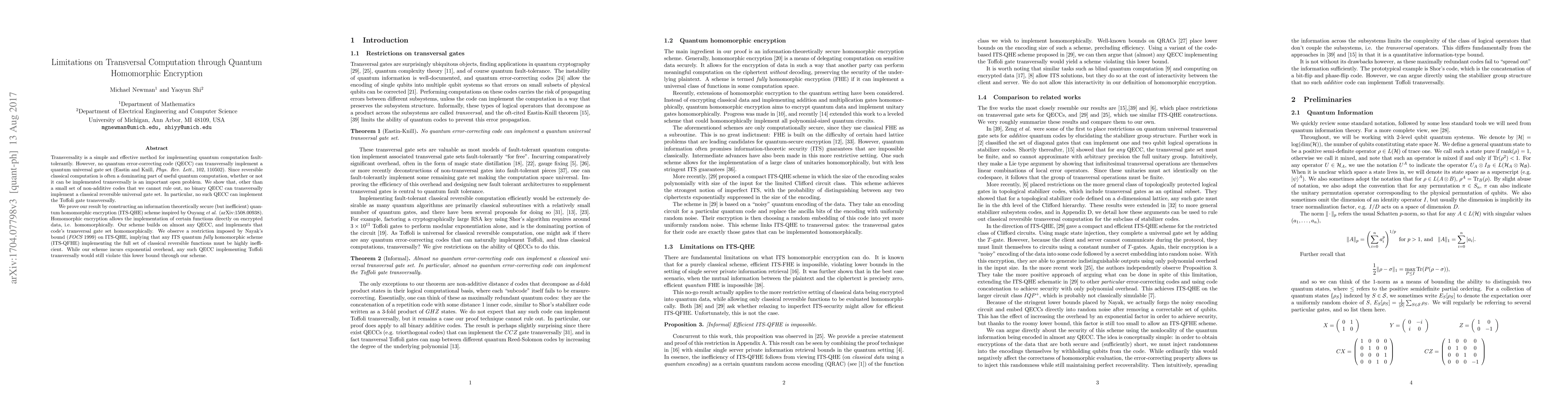 This paper demonstrates that no binary quantum error-correcting code (QECC) can transversally implement a classical reversible universal gate set, particularly the Toffoli gate. The authors prove this by constructing an information theoretically secure quantum homomorphic encryption scheme, revealing a restriction imposed by Nayak's bound that renders any fully efficient quantum fully homomorphic encryption scheme highly inefficient.