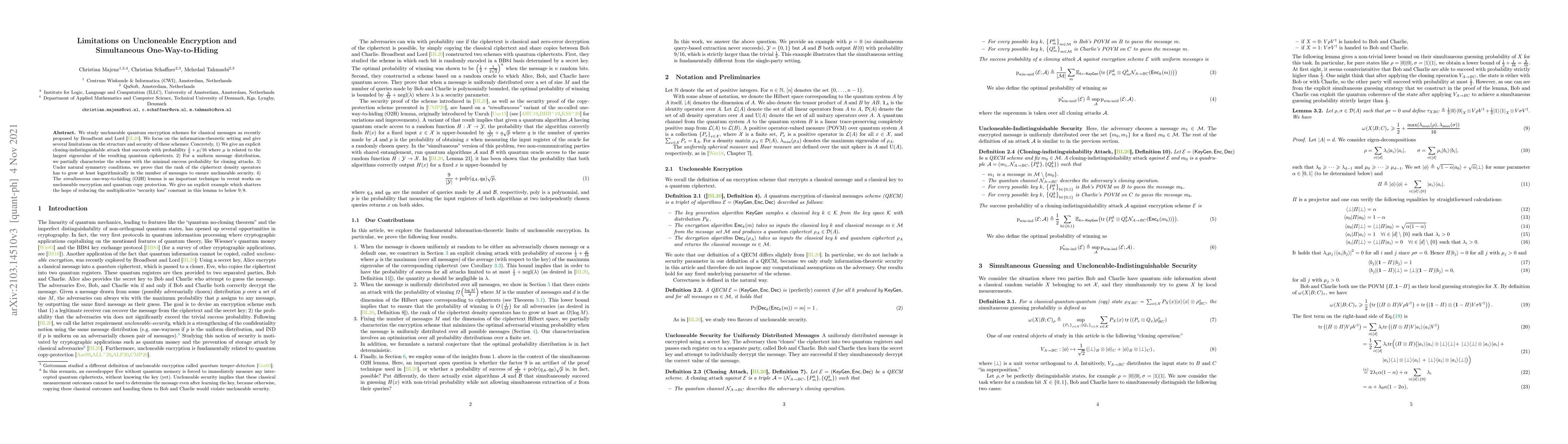 Researchers found limitations on uncloneable quantum encryption schemes, including a cloning-indistinguishable attack that succeeds with high probability and a logarithmic growth requirement for security, shattering hopes of reducing the multiplicative security loss constant in recent techniques.
