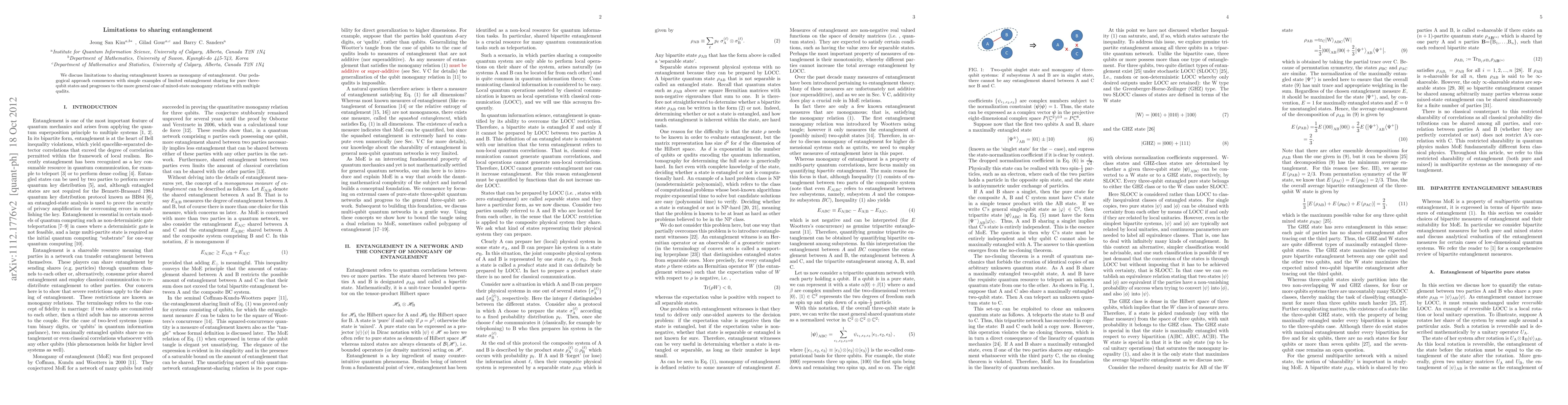 We discuss limitations to sharing entanglement known as monogamy of entanglement. Our pedagogical approach commences with simple examples of limited entanglement sharing for pure three-qubit states and progresses to the more general case of mixed-state monogamy relations with multiple qudits.