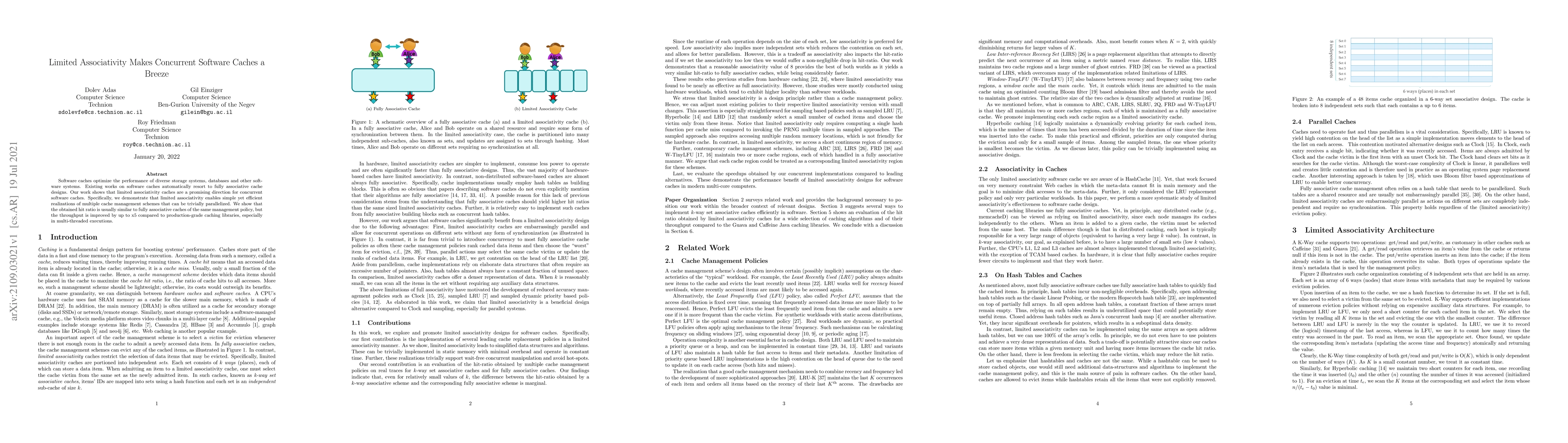 This paper proposes that limited associativity in software caches can achieve similar hit ratios to fully associative designs while significantly improving throughput, especially in multi-threaded environments, by enabling simpler and more easily parallelizable cache management schemes. The results show up to X5 improvement over existing caching libraries.