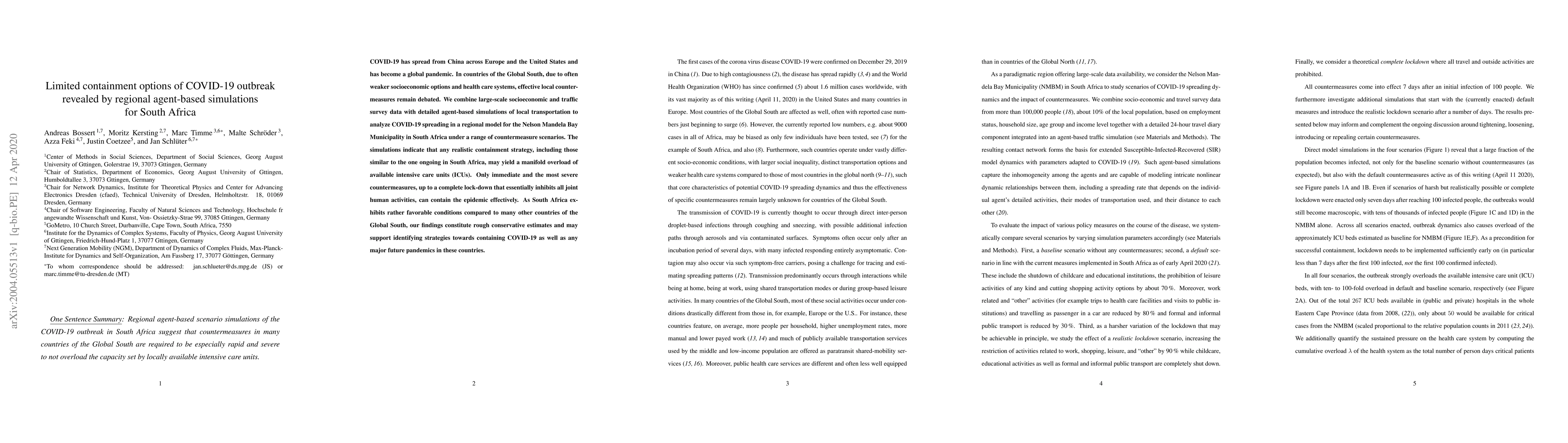 COVID-19 has spread from China across Europe and the United States and has become a global pandemic. In countries of the Global South, due to often weaker socioeconomic options and health care systems, effective local countermeasures remain debated. We combine large-scale socioeconomic and traffic survey data with detailed agent-based simulations of local transportation to analyze COVID-19 spreading in a regional model for the Nelson Mandela Bay Municipality in South Africa under a range of countermeasure scenarios. The simulations indicate that any realistic containment strategy, including those similar to the one ongoing in South Africa, may yield a manifold overload of available intensive care units (ICUs). Only immediate and the most severe countermeasures, up to a complete lock-down that essentially inhibits all joint human activities, can contain the epidemic effectively. As South Africa exhibits rather favorable conditions compared to many other countries of the Global South, our findings constitute rough conservative estimates and may support identifying strategies towards containing COVID-19 as well as any major future pandemics in these countries.