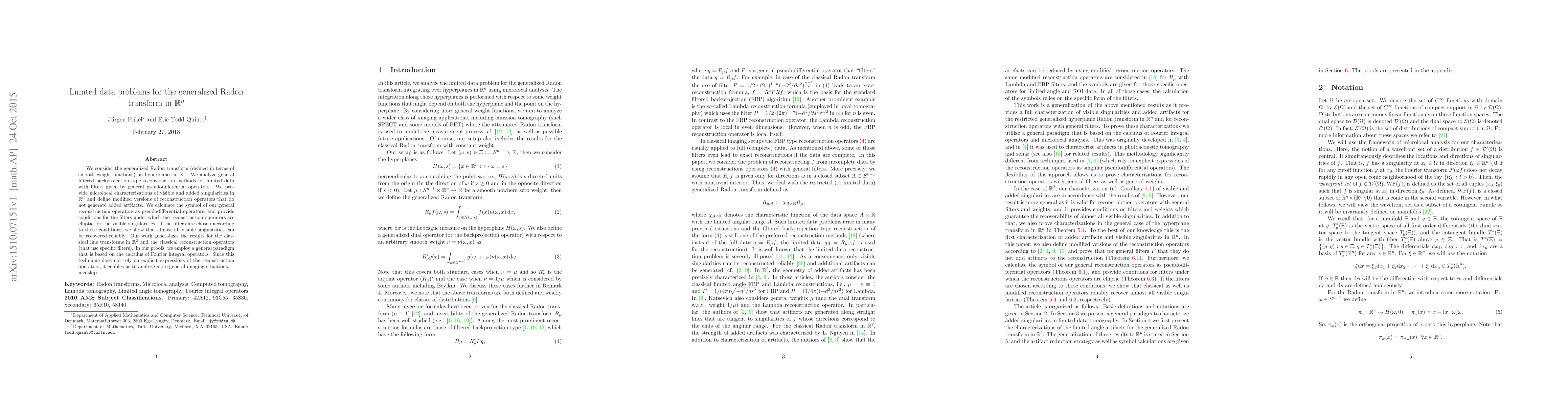 The paper investigates reconstruction methods for limited data in the generalized Radon transform in $oxed{ ext{R}^n}$, providing conditions under which almost all visible singularities can be recovered reliably.