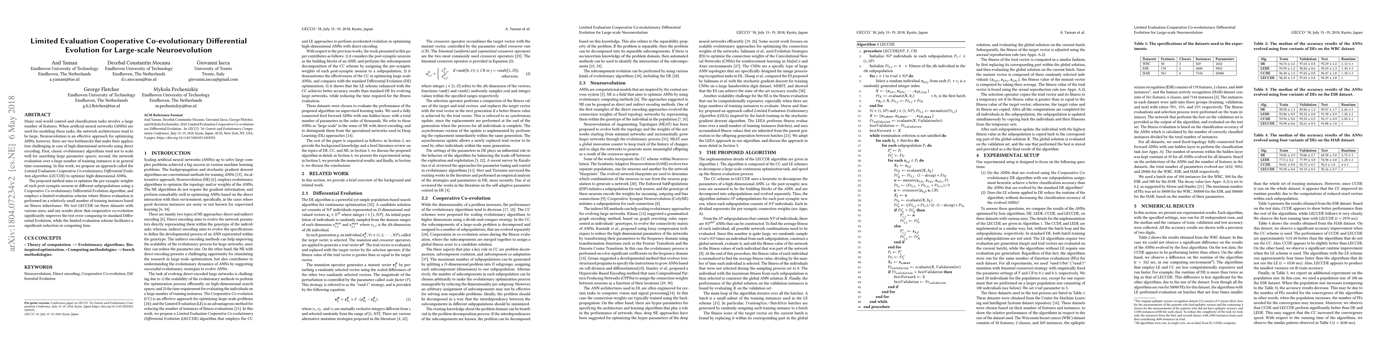 This paper proposes LECCDE, an algorithm that optimizes high-dimensional neural networks using cooperative co-evolutionary differential evolution with a limited evaluation scheme, improving test error while reducing computing time.