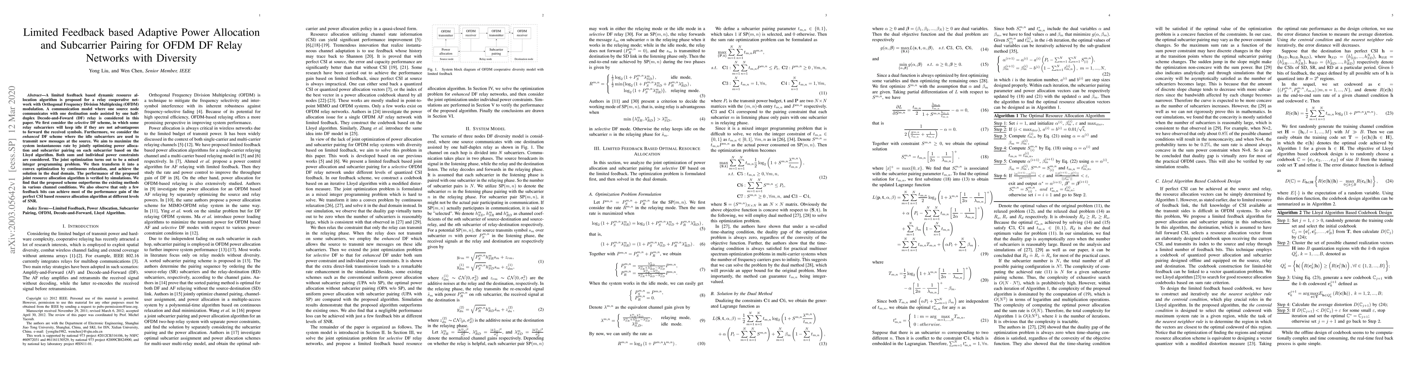 This paper proposes a limited feedback adaptive power allocation and subcarrier pairing algorithm for OFDM-based DF relay networks to maximize system instantaneous rate. It considers selective and enhanced DF schemes, transforming the mixed integer programming problem into a convex optimization via continuous relaxation and solving it in the dual domain.