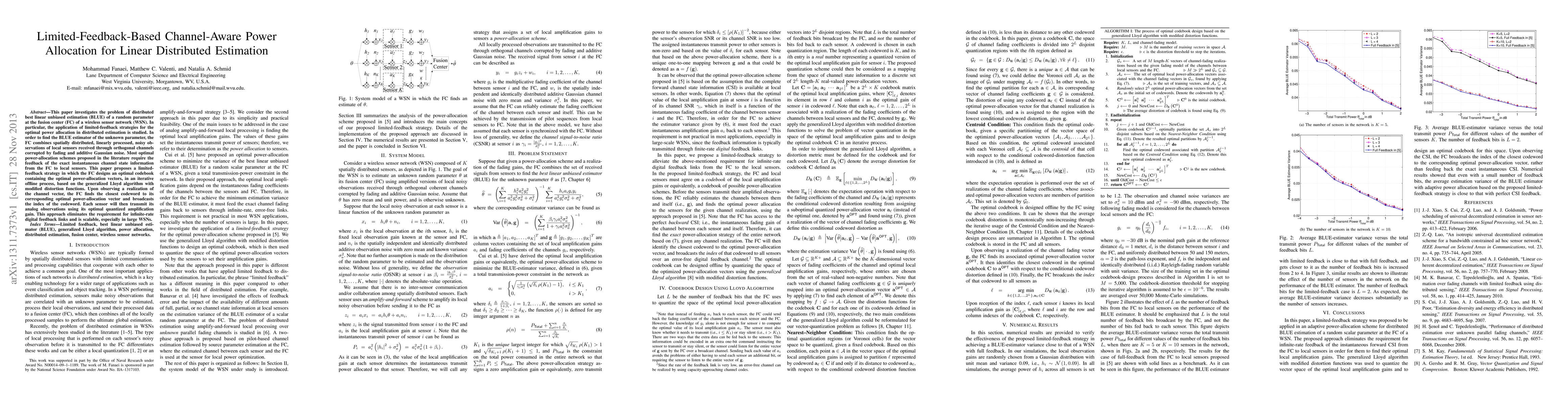 This paper proposes a limited-feedback strategy for optimal power allocation in distributed estimation within a wireless sensor network, using a codebook designed via the generalized Lloyd algorithm. This method reduces the need for high-rate digital feedback and enhances scalability in large networks.