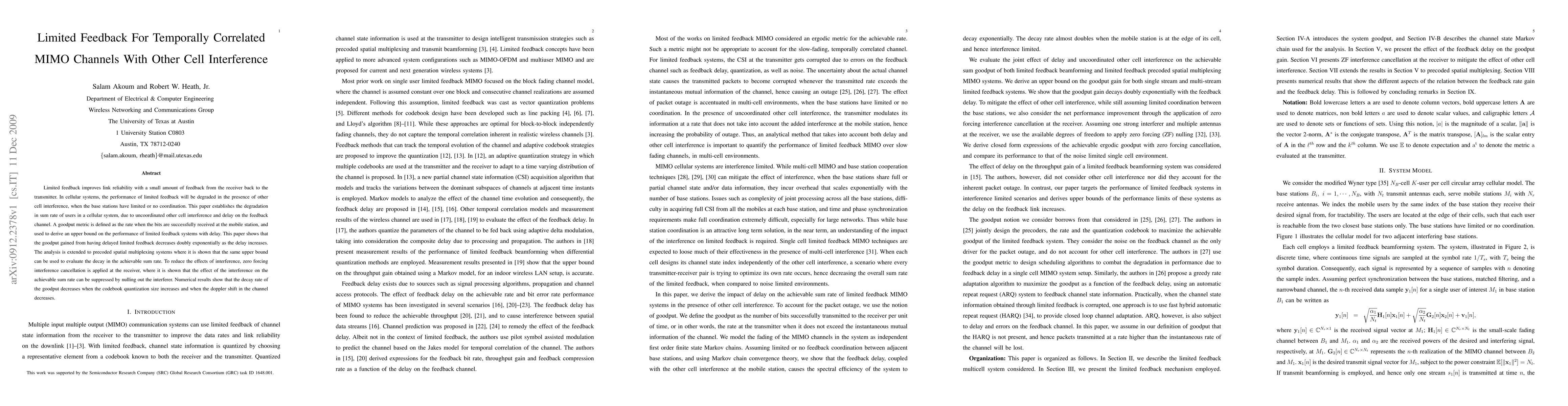 This paper investigates the performance degradation of limited feedback in MIMO channels under other cell interference, showing that the goodput decreases doubly exponentially with feedback delay. It proposes zero forcing interference cancellation to mitigate interference effects and demonstrates that the achievable sum rate can be evaluated using an upper bound.
