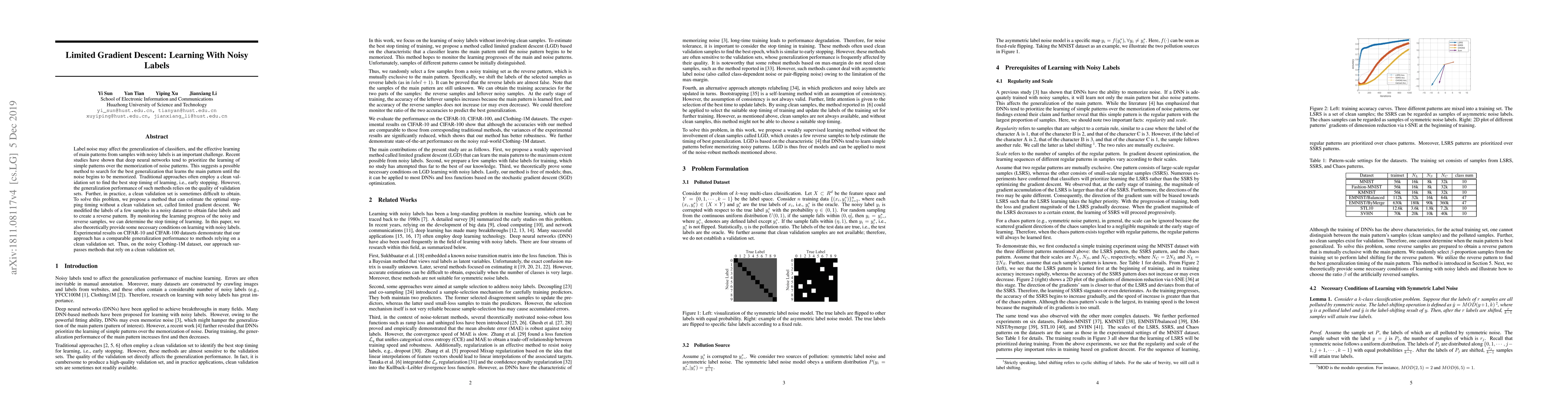 Label noise may affect the generalization of classifiers, and the effective learning of main patterns from samples with noisy labels is an important challenge. Recent studies have shown that deep neural networks tend to prioritize the learning of simple patterns over the memorization of noise patterns. This suggests a possible method to search for the best generalization that learns the main pattern until the noise begins to be memorized. Traditional approaches often employ a clean validation set to find the best stop timing of learning, i.e., early stopping. However, the generalization performance of such methods relies on the quality of validation sets. Further, in practice, a clean validation set is sometimes difficult to obtain. To solve this problem, we propose a method that can estimate the optimal stopping timing without a clean validation set, called limited gradient descent. We modified the labels of a few samples in a noisy dataset to obtain false labels and to create a reverse pattern. By monitoring the learning progress of the noisy and reverse samples, we can determine the stop timing of learning. In this paper, we also theoretically provide some necessary conditions on learning with noisy labels. Experimental results on CIFAR-10 and CIFAR-100 datasets demonstrate that our approach has a comparable generalization performance to methods relying on a clean validation set. Thus, on the noisy Clothing-1M dataset, our approach surpasses methods that rely on a clean validation set.