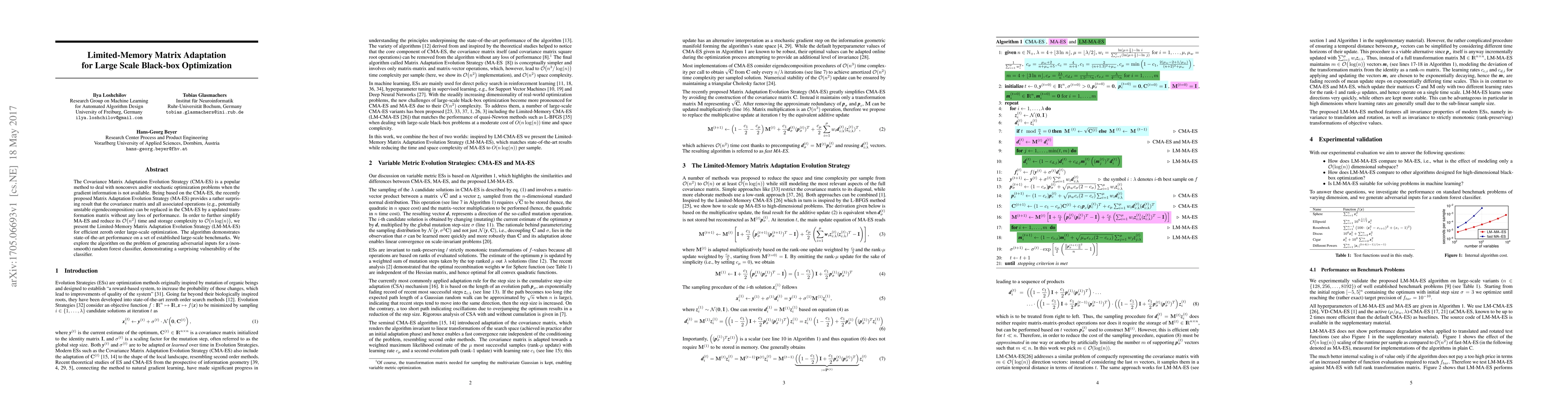 The paper proposes the Limited-Memory Matrix Adaptation Evolution Strategy (LM-MA-ES) to simplify and reduce the complexity of the Matrix Adaptation Evolution Strategy (MA-ES) for large-scale black-box optimization, achieving state-of-the-art performance on benchmarks. The algorithm also reveals vulnerabilities in non-smooth classifiers like random forests when generating adversarial inputs.