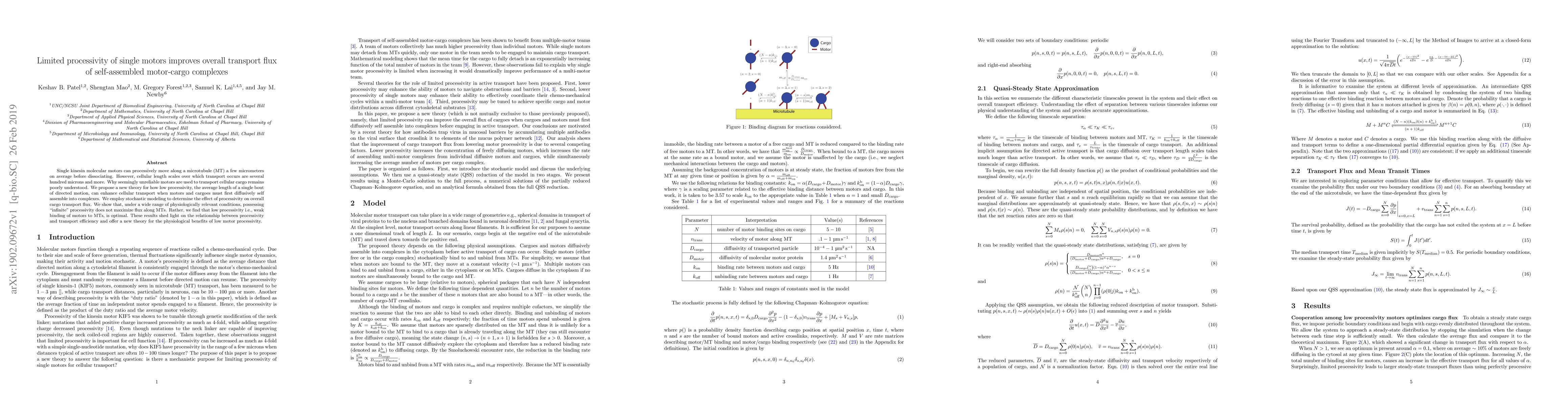 This paper proposes that low processivity of single kinesin motors enhances overall transport efficiency in cellular cargo complexes by facilitating their self-assembly through diffusion. Stochastic modeling reveals that low processivity, characterized by weak motor-microtubule binding, optimizes transport flux over long cellular distances.