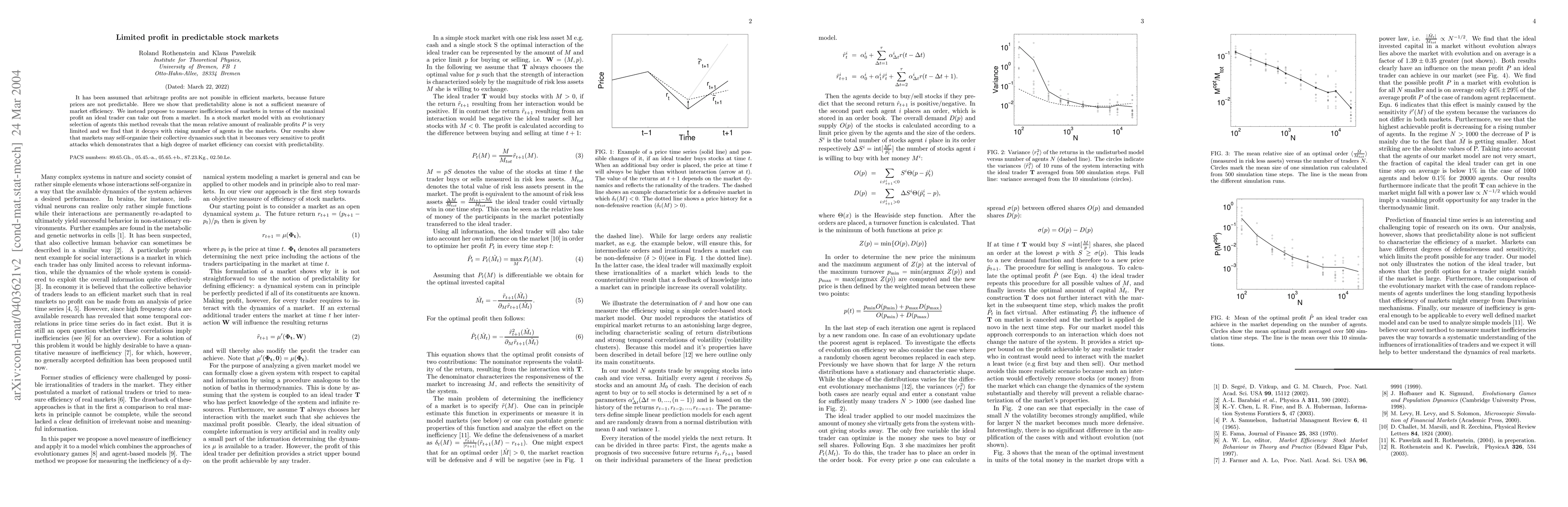 It has been assumed that arbitrage profits are not possible in efficient markets, because future prices are not predictable. Here we show that predictability alone is not a sufficient measure of market efficiency. We instead propose to measure inefficiencies of markets in terms of the maximal profit an ideal trader can take out from a market. In a stock market model with an evolutionary selection of agents this method reveals that the mean relative amount of realizable profits $P$ is very limited and we find that it decays with rising number of agents in the markets. Our results show that markets may self-organize their collective dynamics such that it becomes very sensitive to profit attacks which demonstrates that a high degree of market efficiency can coexist with predictability.