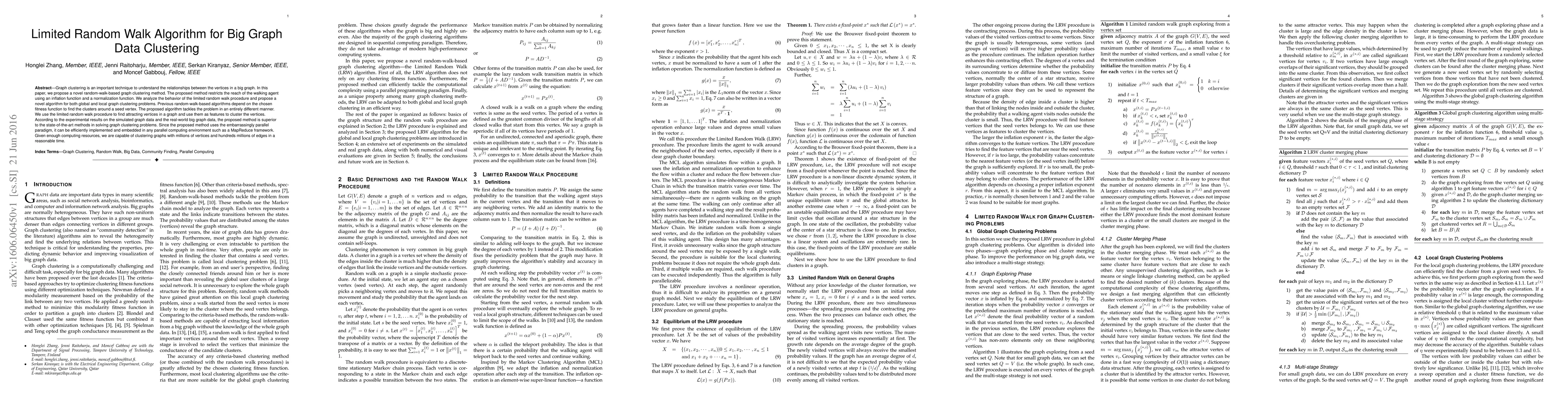 Graph clustering is an important technique to understand the relationships between the vertices in a big graph. In this paper, we propose a novel random-walk-based graph clustering method. The proposed method restricts the reach of the walking agent using an inflation function and a normalization function. We analyze the behavior of the limited random walk procedure and propose a novel algorithm for both global and local graph clustering problems. Previous random-walk-based algorithms depend on the chosen fitness function to find the clusters around a seed vertex. The proposed algorithm tackles the problem in an entirely different manner. We use the limited random walk procedure to find attracting vertices in a graph and use them as features to cluster the vertices. According to the experimental results on the simulated graph data and the real-world big graph data, the proposed method is superior to the state-of-the-art methods in solving graph clustering problems. Since the proposed method uses the embarrassingly parallel paradigm, it can be efficiently implemented and embedded in any parallel computing environment such as a MapReduce framework. Given enough computing resources, we are capable of clustering graphs with millions of vertices and hundreds millions of edges in a reasonable time.