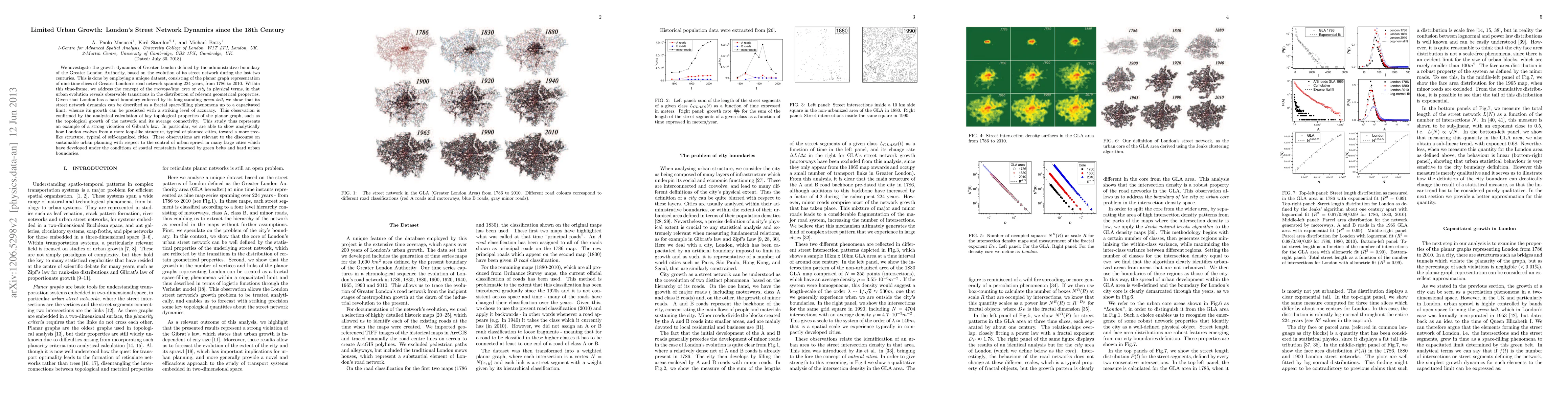 We investigate the growth dynamics of Greater London defined by the administrative boundary of the Greater London Authority, based on the evolution of its street network during the last two centuries. This is done by employing a unique dataset, consisting of the planar graph representation of nine time slices of Greater London's road network spanning 224 years, from 1786 to 2010. Within this time-frame, we address the concept of the metropolitan area or city in physical terms, in that urban evolution reveals observable transitions in the distribution of relevant geometrical properties. Given that London has a hard boundary enforced by its long-standing green belt, we show that its street network dynamics can be described as a fractal space-filling phenomena up to a capacitated limit, whence its growth can be predicted with a striking level of accuracy. This observation is confirmed by the analytical calculation of key topological properties of the planar graph, such as the topological growth of the network and its average connectivity. This study thus represents an example of a strong violation of Gibrat's law. In particular, we are able to show analytically how London evolves from a more loop-like structure, typical of planned cities, toward a more tree-like structure, typical of self-organized cities. These observations are relevant to the discourse on sustainable urban planning with respect to the control of urban sprawl in many large cities, which have developed under the conditions of spatial constraints imposed by green belts and hard urban boundaries.