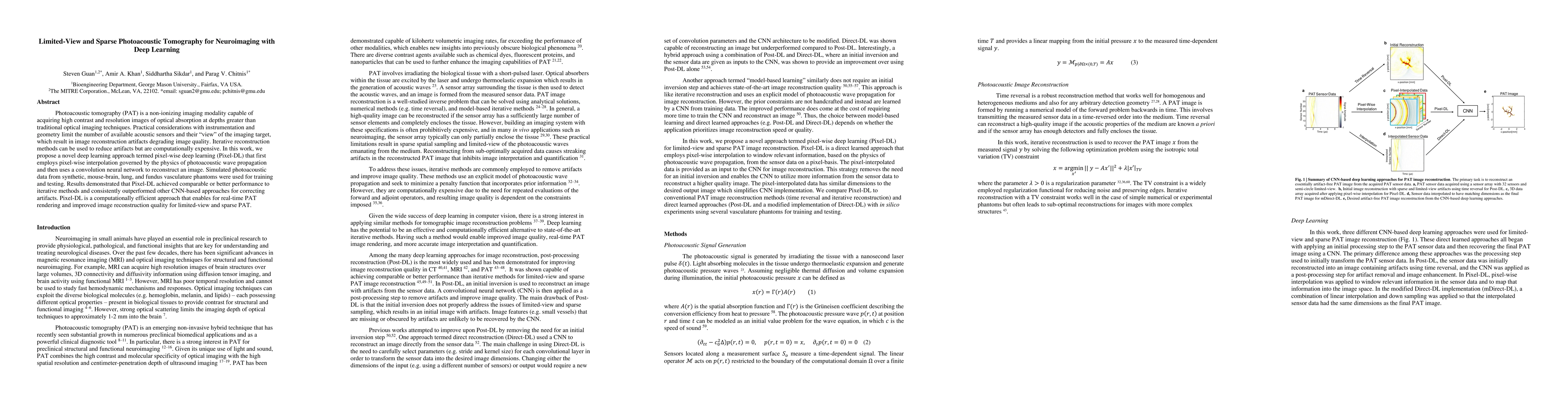 Photoacoustic tomography (PAT) is a nonionizing imaging modality capable of acquiring high contrast and resolution images of optical absorption at depths greater than traditional optical imaging techniques. Practical considerations with instrumentation and geometry limit the number of available acoustic sensors and their view of the imaging target, which result in significant image reconstruction artifacts degrading image quality. Iterative reconstruction methods can be used to reduce artifacts but are computationally expensive. In this work, we propose a novel deep learning approach termed pixelwise deep learning (PixelDL) that first employs pixelwise interpolation governed by the physics of photoacoustic wave propagation and then uses a convolution neural network to directly reconstruct an image. Simulated photoacoustic data from synthetic vasculature phantom and mouse-brain vasculature were used for training and testing, respectively. Results demonstrated that PixelDL achieved comparable performance to iterative methods and outperformed other CNN-based approaches for correcting artifacts. PixelDL is a computationally efficient approach that enables for realtime PAT rendering and for improved image quality, quantification, and interpretation.