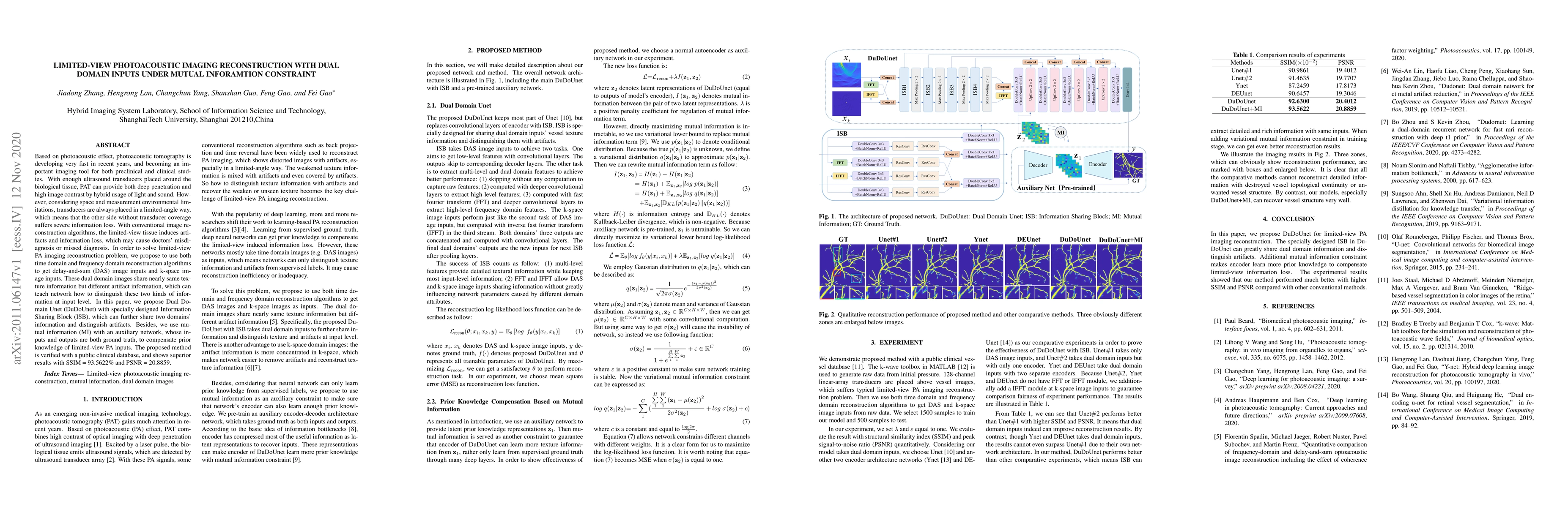 This paper proposes a Dual Domain Unet (DuDoUnet) for limited-view photoacoustic imaging reconstruction, combining time-domain and frequency-domain inputs under a mutual information constraint to enhance image quality. The method uses an Information Sharing Block to distinguish artifact information and compensates for information loss through an auxiliary network, achieving superior results with high SSIM and PSNR values.