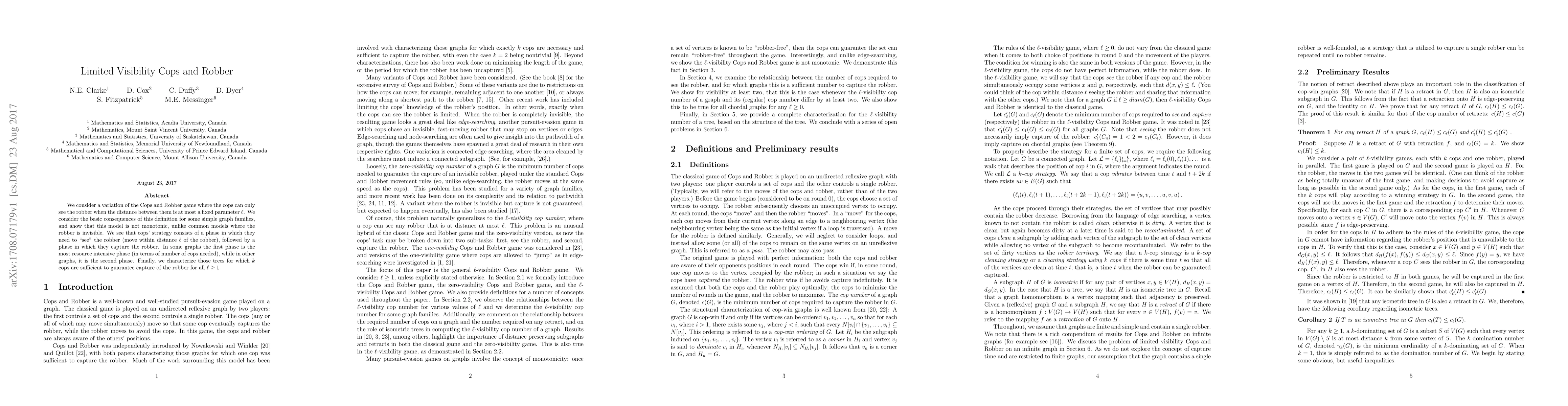 The paper analyzes the 'Limited Visibility Cops and Robbers' game, where cops can only see the robber if within a distance \ell, examining basic consequences for simple graph families.