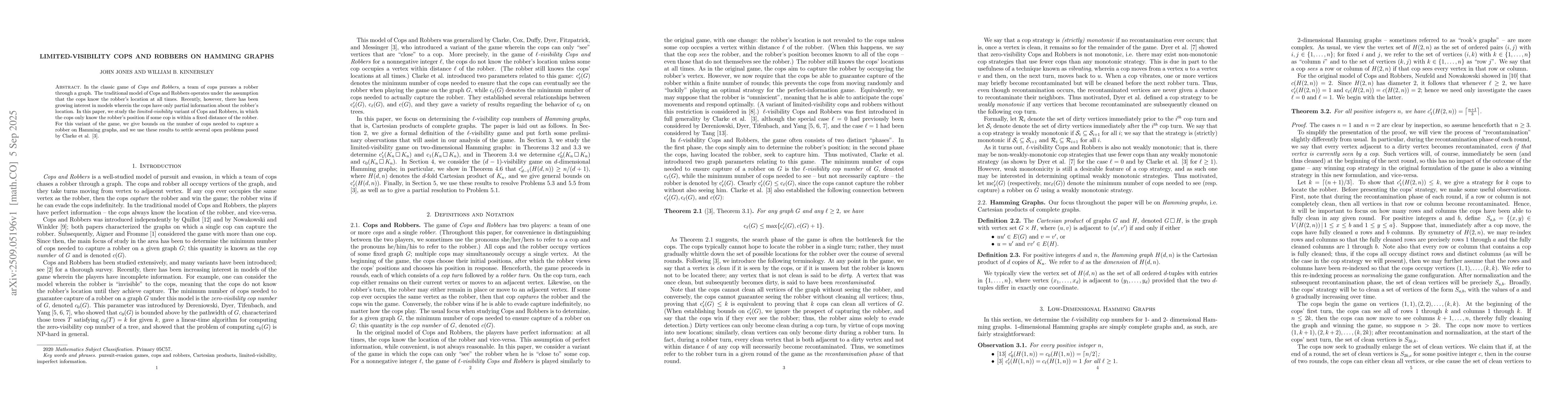 In the classic game of Cops and Robbers, a team of cops pursues a robber through a graph. The traditional model of Cops and Robbers operates under the assumption that the cops know the robber's location at all times. Recently, however, there has been growing interest in models wherein the cops have only partial information about the robber's location. In this paper, we study the limited-visibility variant of Cops and Robbers, in which the cops only know the robber's position if some cop is within a fixed distance of the robber. For this variant of the game, we give bounds on the number of cops needed to capture a robber on Hamming graphs, and we use these results to settle several open problems posed by Clarke et al.