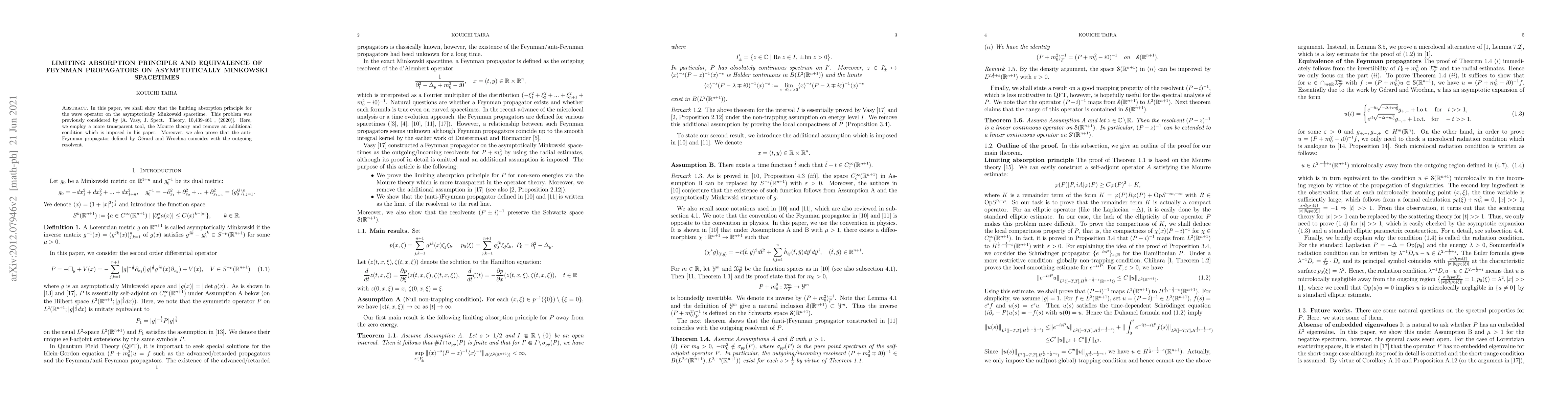 This paper demonstrates the limiting absorption principle for the wave operator on asymptotically Minkowski spacetimes using Mourre theory, and removes a condition previously imposed. It also proves the equivalence of the anti-Feynman propagator with the outgoing resolvent.