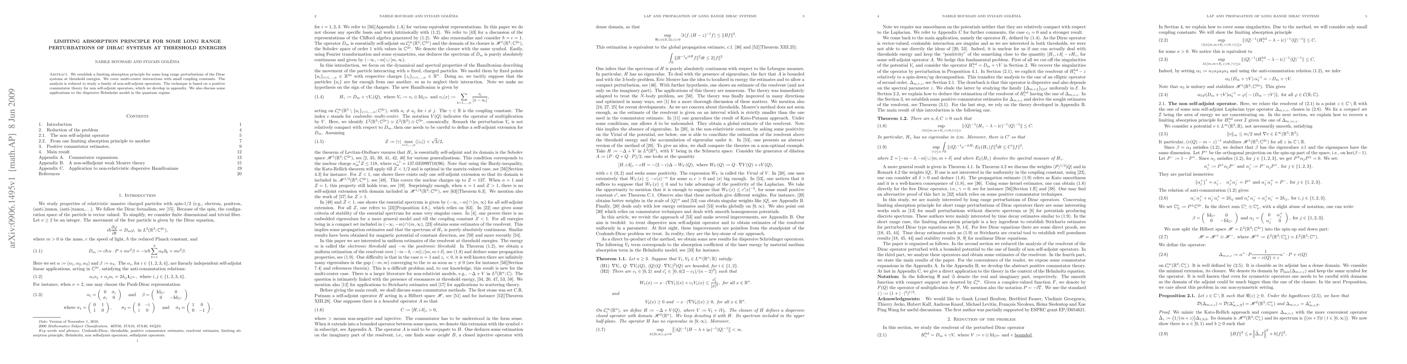 We establish a limiting absorption principle for some long range perturbations of the Dirac systems at threshold energies. We cover multi-center interactions with small coupling constants. The analysis is reduced to study a family of non-self-adjoint operators. The technique is based on a positive commutator theory for non self-adjoint operators, which we develop in appendix. We also discuss some applications to the dispersive Helmholzt model in the quantum regime.