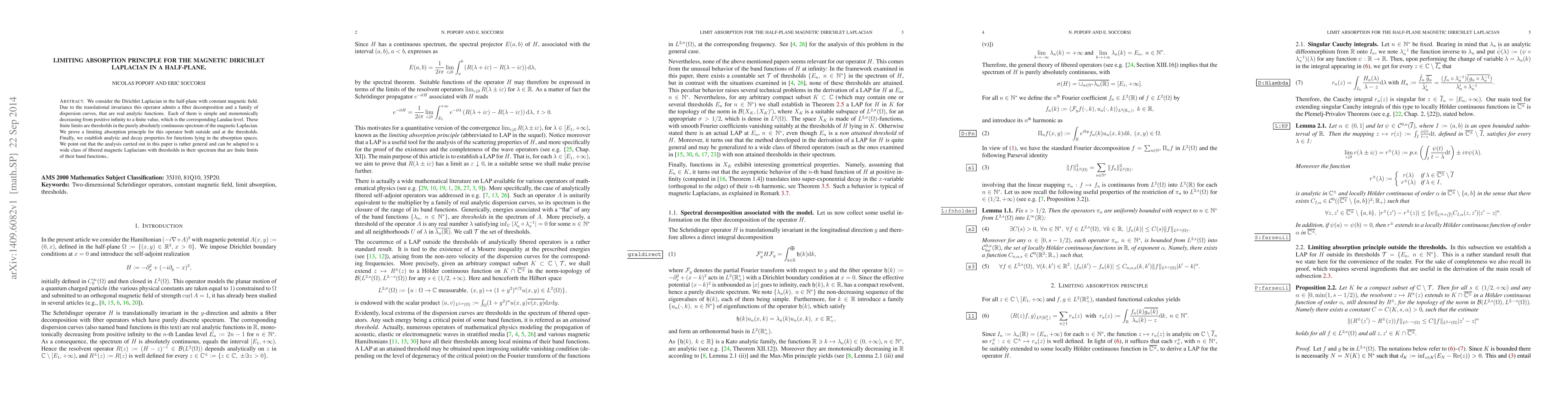 We consider the Dirichlet Laplacian in the half-plane with constant magnetic field. Due to the translational invariance this operator admits a fiber decomposition and a family of dis- persion curves, that are real analytic functions. Each of them is simple and monotically decreasing from positive infinity to a finite value, which is the corresponding Landau level. These finite limits are thresholds in the purely absolutely continuous spectrum of the magnetic Laplacian. We prove a limiting absorption principle for this operator both outside and at the thresholds. Finally, we establish analytic and decay properties for functions lying in the absorption spaces. We point out that the analysis carried out in this paper is rather general and can be adapted to a wide class of fibered magnetic Laplacians with thresholds in their spectrum that are finite limits of their band functions.