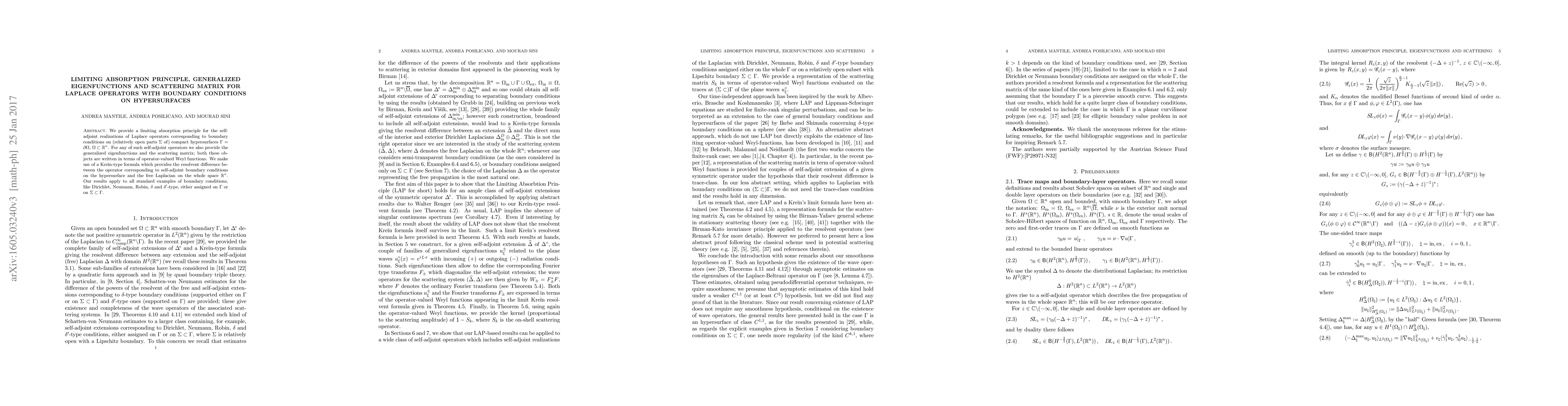 We provide a limiting absorption principle for the self-adjoint realizations of Laplace operators corresponding to boundary conditions on (relatively open parts $\Sigma$ of) compact hypersurfaces $\Gamma=\partial\Omega$, $\Omega\subset{\mathbb{R}}^{n}$. For any of such self-adjoint operators we also provide the generalized eigenfunctions and the scattering matrix; both these objects are written in terms of operator-valued Weyl functions. We make use of a Krein-type formula which provides the resolvent difference between the operator corresponding to self-adjoint boundary conditions on the hypersurface and the free Laplacian on the whole space ${\mathbb{R}}^{n}$. Our results apply to all standard examples of boundary conditions, like Dirichlet, Neumann, Robin, $\delta$ and $\delta'$-type, either assigned on $\Gamma$ or on $\Sigma\subset\Gamma$.