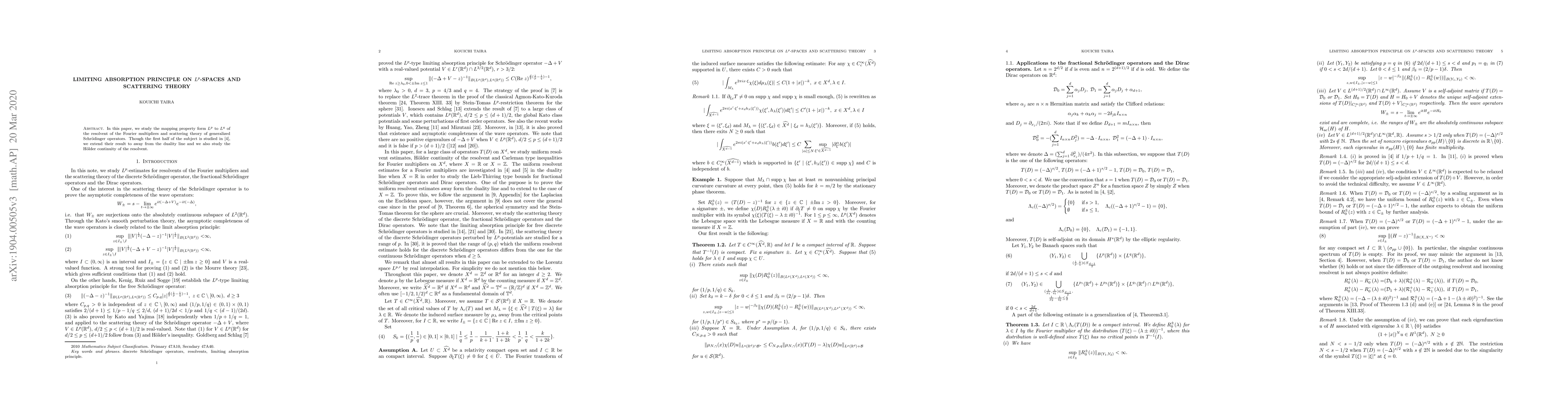 This paper extends the limiting absorption principle for Fourier multiplier operators to $L^p$ spaces, away from the duality line, and investigates the H\"older continuity of the resolvent, while also exploring the scattering theory of generalized Schr\"odinger operators.