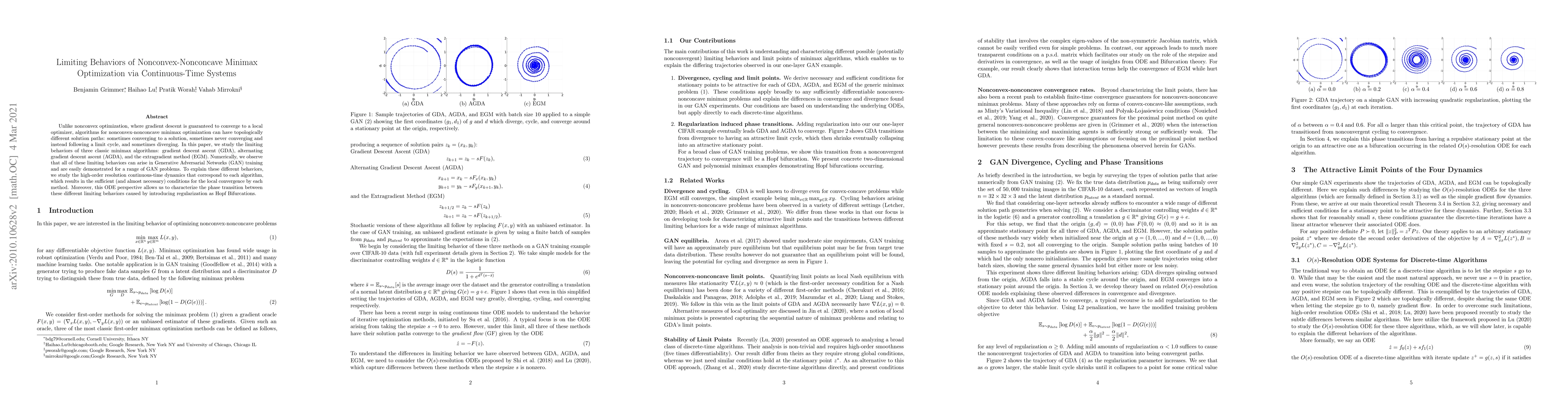 This paper investigates the diverse limiting behaviors of three classic minimax optimization algorithms—GDA, AGDA, and EGM—in nonconvex-nonconcave settings, using continuous-time dynamics. It demonstrates these behaviors in GAN training and explains them through the corresponding high-order resolution ODE models, revealing phase transitions due to regularization as Hopf bifurcations.