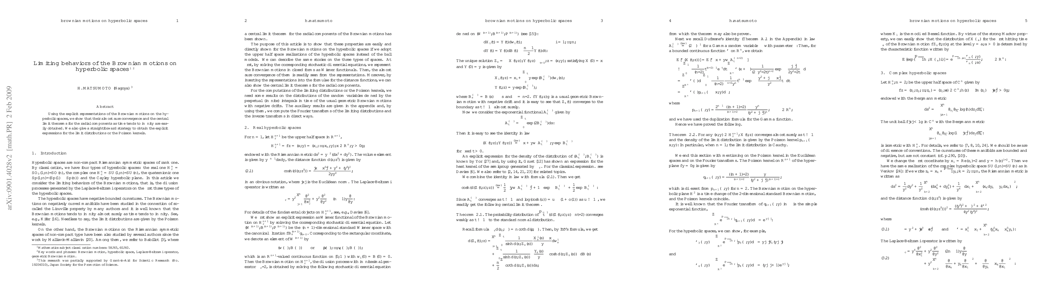 Summary: This paper demonstrates the almost sure convergence and central limit theorems for Brownian motions on hyperbolic spaces, focusing on the radial components as time approaches infinity, and provides a method to derive the explicit expressions for the limit distributions or Poisson kernels.
