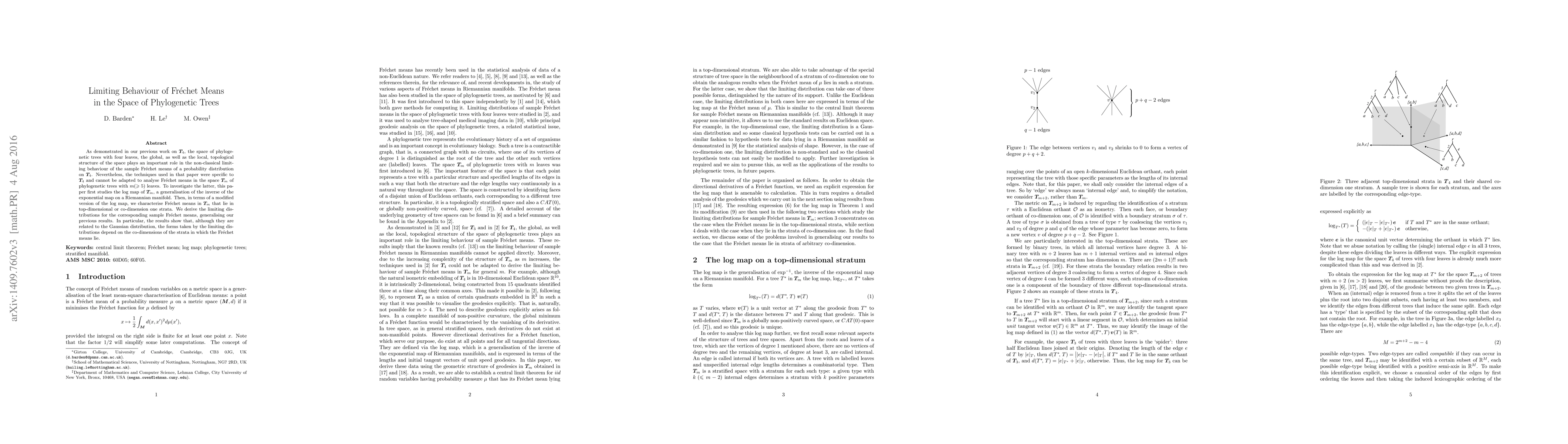 As demonstrated in our previous work on ${\boldsymbol T}_{4}$, the space of phylogenetic trees with four leaves, the global, as well as the local, topological structure of the space plays an important role in the non-classical limiting behaviour of the sample Fr\'echet means of a probability distribution on ${\boldsymbol T}_{4}$. Nevertheless, the techniques used in that paper were specific to ${\boldsymbol T}_{4}$ and cannot be adapted to analyse Fr\'echet means in the space ${\boldsymbol T}_{m}$ of phylogenetic trees with $m(\geqslant5)$ leaves. To investigate the latter, this paper first studies the log map of ${\boldsymbol T}_{m}$, a generalisation of the inverse of the exponential map on a Riemannian manifold. Then, in terms of a modified version of the log map, we characterise Fr\'echet means in ${\boldsymbol T}_{m}$ that lie in top-dimensional or co-dimension one strata. We derive the limiting distributions for the corresponding sample Fr\'echet means, generalising our previous results. In particular, the results show that, although they are related to the Gaussian distribution, the forms taken by the limiting distributions depend on the co-dimensions of the strata in which the Fr\'echet means lie.