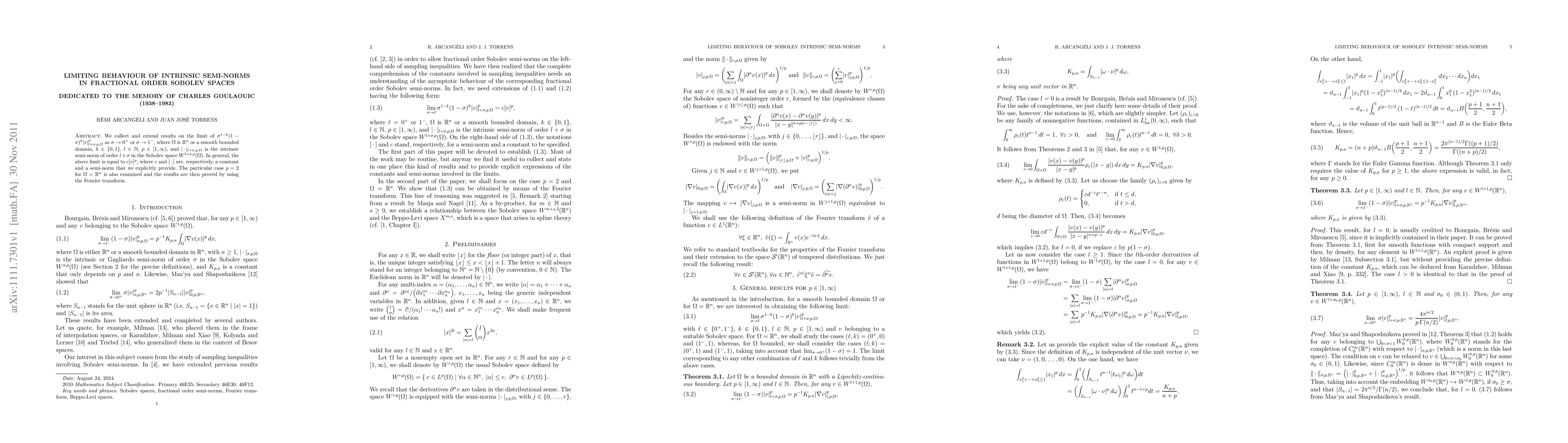 We collect and extend results on the limit of $\sigma^{1-k}(1-\sigma)^k |v|_{l+\sigma,p,\Omega}^p$ as $\sigma$ tends to $0^+$ or $1^-$, where $\Omega$ is $\mathbb{R}^n$ or a smooth bounded domain, $k$ is 0 or 1, $l$ is a nonnegative integer, $p\in[1,\infty)$, and $|.|_{l+\sigma,p,\Omega}$ is the intrinsic semi-norm of order $l+\sigma$ in the Sobolev space $W^{l+\sigma,p}(\Omega)$. In general, the above limit is equal to $c[v]^p$, where $c$ and $[.]$ are, respectively, a constant and a semi-norm that we explicitly provide. The particular case $p=2$ for $\Omega=\mathbb{R}^n$ is also examined and the results are then proved by using the Fourier transform.