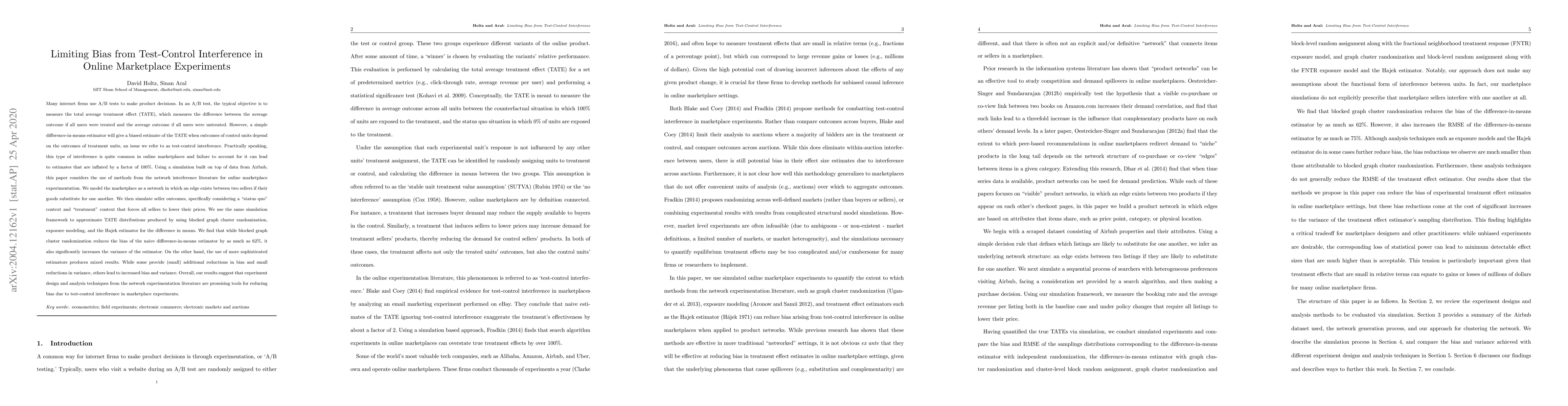 This paper explores the bias in A/B test results due to test-control interference in online marketplace experiments, using Airbnb data to simulate seller outcomes. It finds that while blocked graph cluster randomization reduces bias, it increases variance, and more sophisticated estimators yield mixed results, suggesting that network experimentation methods can help mitigate interference bias.