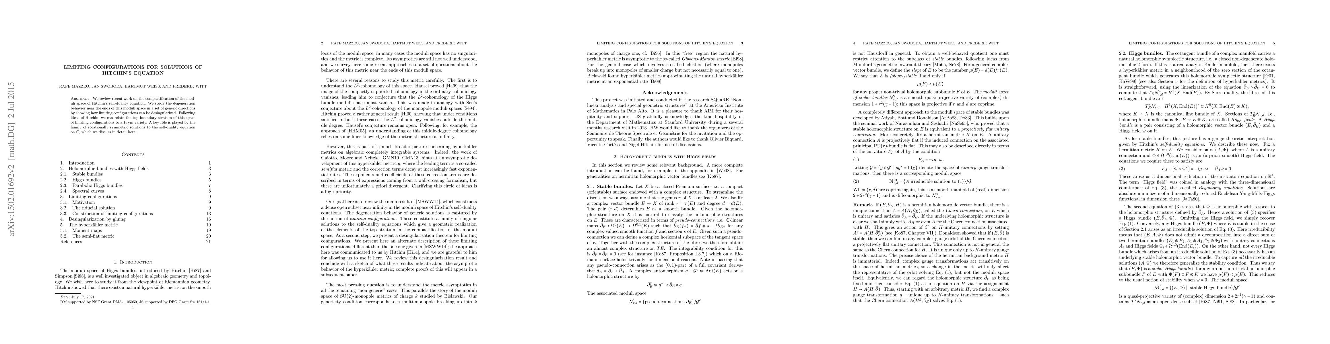 We review recent work on the compactification of the moduli space of Hitchin's self-duality equation. We study the degeneration behavior near the ends of this moduli space in a set of generic directions by showing how limiting configurations can be desingularized. Following ideas of Hitchin, we can relate the top boundary stratum of this space of limiting configurations to a Prym variety. A key r\^ole is played by the family of rotationally symmetric solutions to the self-duality equation on $\mathbb C$, which we discuss in detail here.