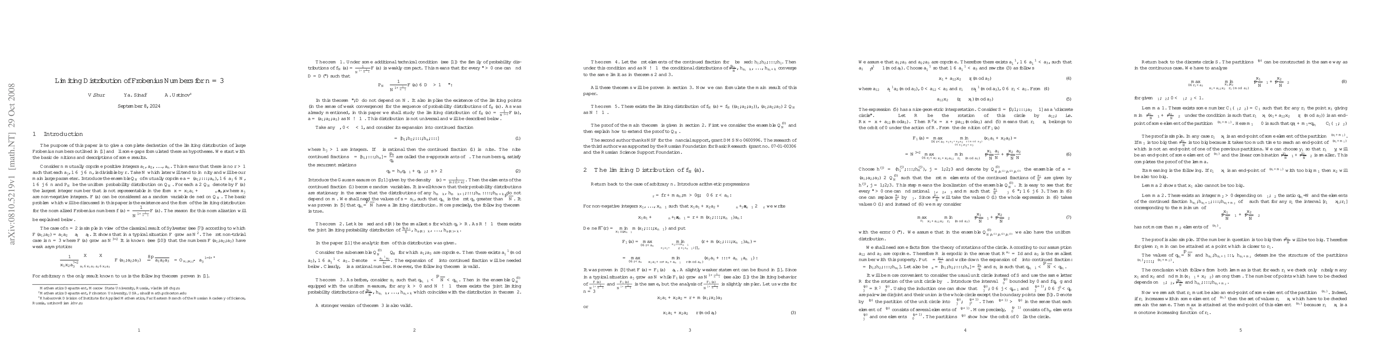 This paper provides a comprehensive derivation of the limiting distribution of large Frobenius numbers for n=3, addressing and resolving certain hypotheses left unproven in prior work by Bourgain and Sinai. It contributes to understanding the behavior of these numbers in number theory.
