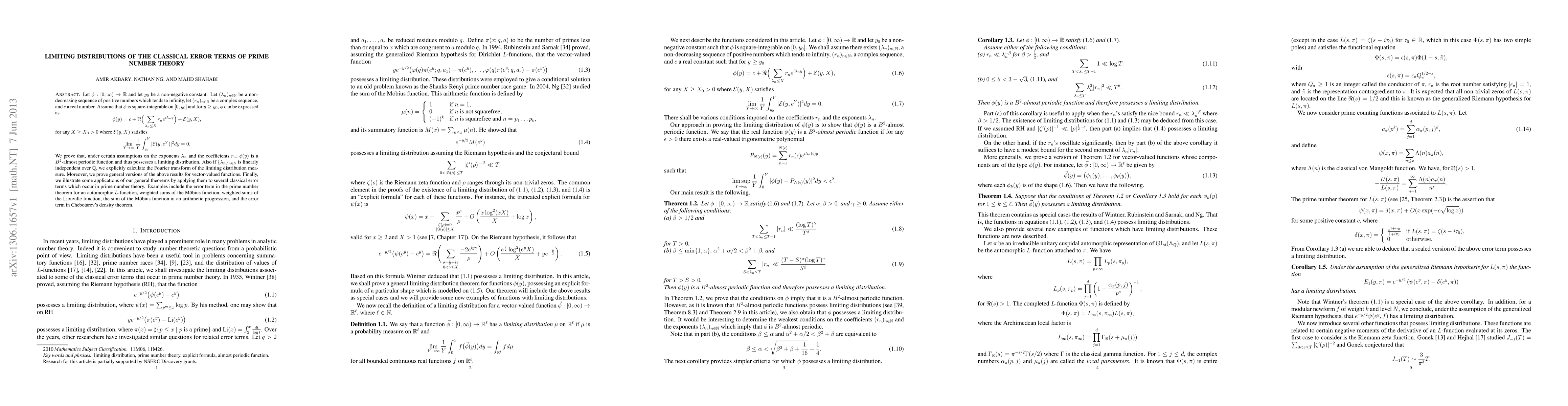 This paper proves a general theorem confirming the existence of limiting distributions for various classical error terms in prime number theory, including results for Wintner, Rubinstein and Sarnak, and Ng, and extends these findings to new contexts such as automorphic $L$-functions and the Liouville function.