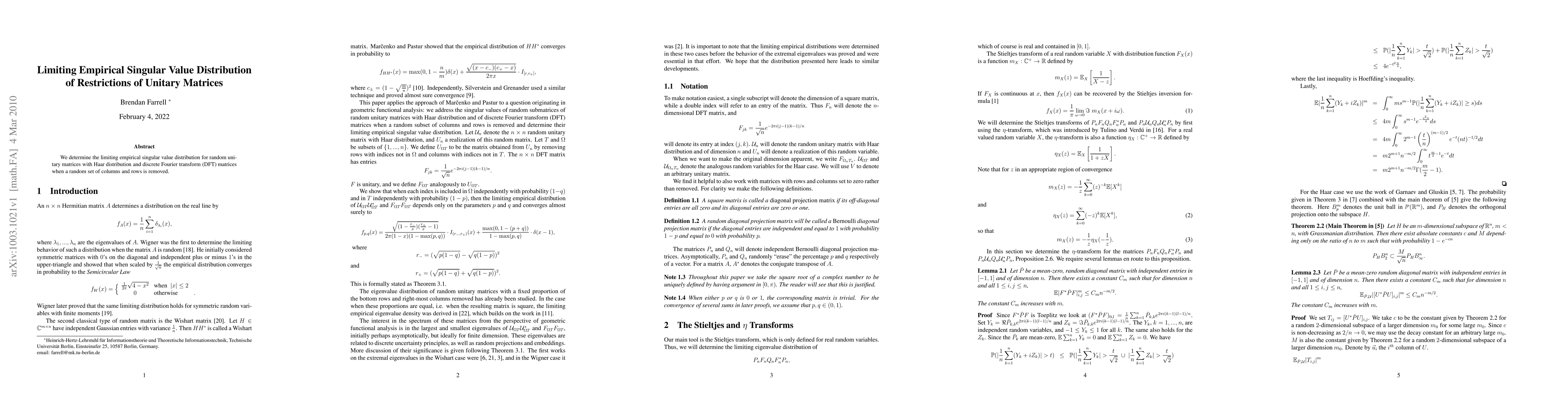 This research determines the limiting empirical singular value distribution for random unitary matrices and discrete Fourier transform matrices after selectively removing a random subset of their columns and rows. The findings provide insights into the structural properties of these matrices under such restrictions.
