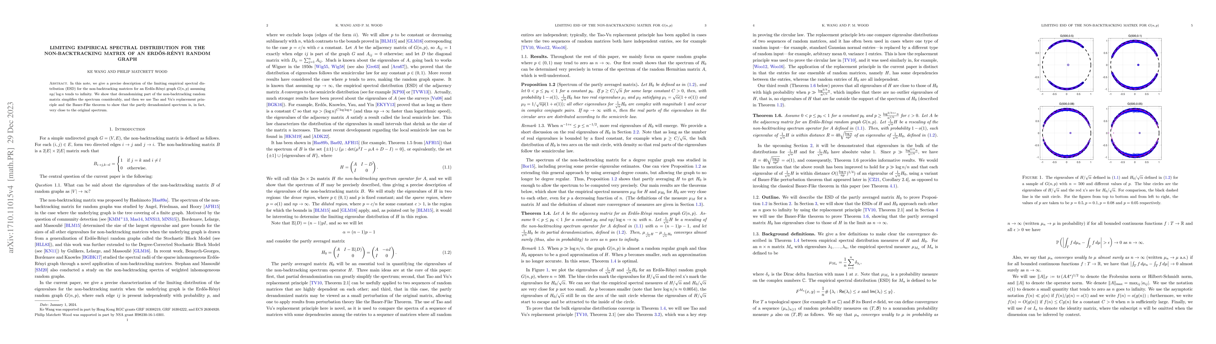 This paper precisely describes the limiting empirical spectral distribution for non-backtracking matrices in an Erdős-Rényi random graph, showing that derandomizing part of the matrix simplifies the spectrum. The authors use Tao and Vu's replacement principle and the Bauer-Fike theorem to demonstrate that the derandomized spectrum closely approximates the original spectrum.
