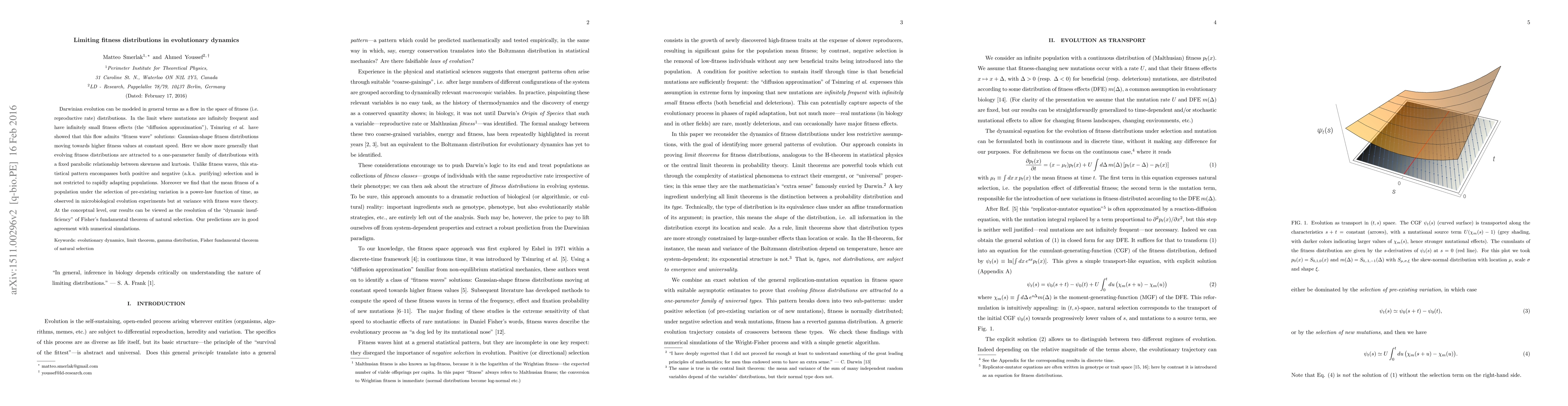 Darwinian evolution can be modeled in general terms as a flow in the space of fitness (i.e. reproductive rate) distributions. In the diffusion approximation, Tsimring et al. have showed that this flow admits "fitness wave" solutions: Gaussian-shape fitness distributions moving towards higher fitness values at constant speed. Here we show more generally that evolving fitness distributions are attracted to a one-parameter family of distributions with a fixed parabolic relationship between skewness and kurtosis. Unlike fitness waves, this statistical pattern encompasses both positive and negative (a.k.a. purifying) selection and is not restricted to rapidly adapting populations. Moreover we find that the mean fitness of a population under the selection of pre-existing variation is a power-law function of time, as observed in microbiological evolution experiments but at variance with fitness wave theory. At the conceptual level, our results can be viewed as the resolution of the "dynamic insufficiency" of Fisher's fundamental theorem of natural selection. Our predictions are in good agreement with numerical simulations.