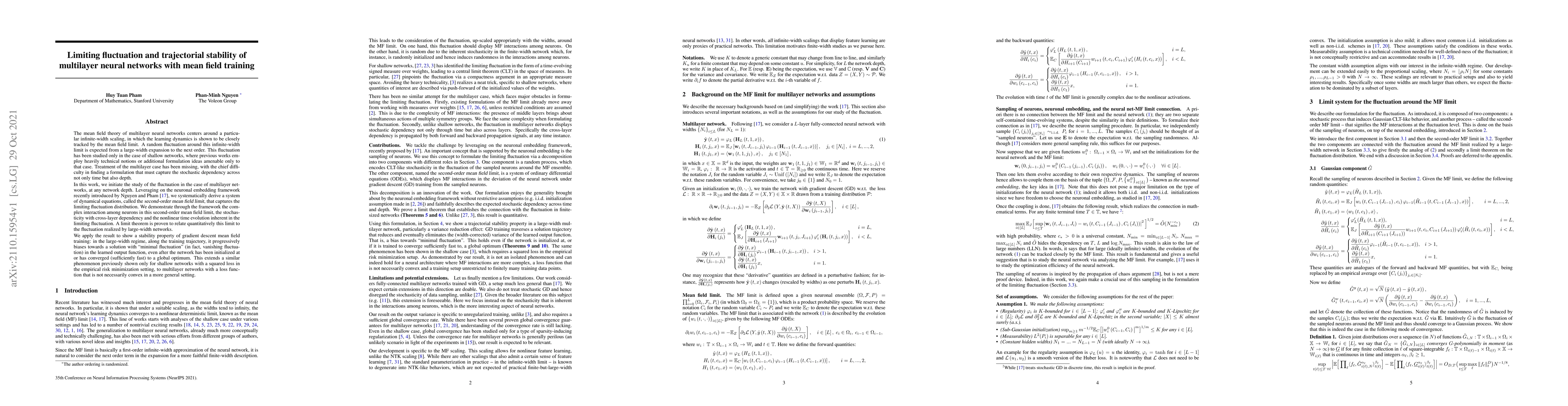 This paper investigates the limiting fluctuation and trajectorial stability in multilayer neural networks trained via mean field theory, introducing a second-order MF limit to capture stochastic dependencies across time and depth. It demonstrates that gradient descent training biases towards solutions with minimal fluctuation in large-width networks, extending this stability property to multilayer networks beyond shallow cases.