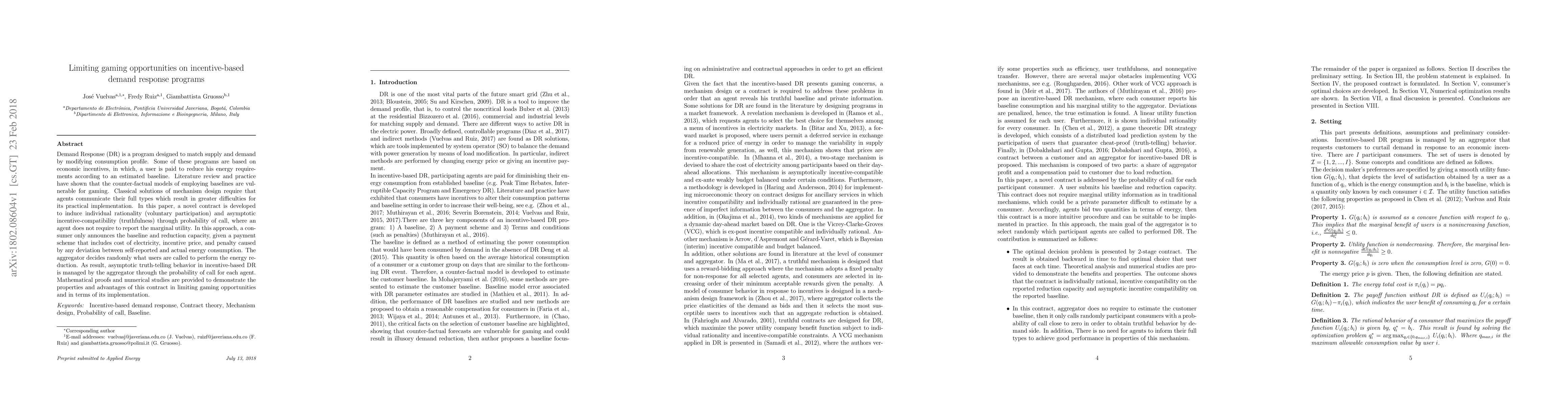 Demand Response (DR) is a program designed to match supply and demand by modifying consumption profile. Some of these programs are based on economic incentives, in which, a user is paid to reduce his energy requirements according to an estimated baseline. Literature review and practice have shown that the counter-factual models of employing baselines are vulnerable for gaming. Classical solutions of mechanism design require that agents communicate their full types which result in greater difficulties for its practical implementation. In this paper, a novel contract is developed to induce individual rationality (voluntary participation) and asymptotic incentive-compatibility (truthfulness) through probability of call, where an agent does not require to report the marginal utility. In this approach, a consumer only announces the baseline and reduction capacity, given a payment scheme that includes cost of electricity, incentive price, and penalty caused by any deviation between self-reported and actual energy consumption. The aggregator decides randomly what users are called to perform the energy reduction. As result, asymptotic truth-telling behavior in incentive-based DR is managed by the aggregator through the probability of call for each agent. Mathematical proofs and numerical studies are provided to demonstrate the properties and advantages of this contract in limiting gaming opportunities and in terms of its implementation.