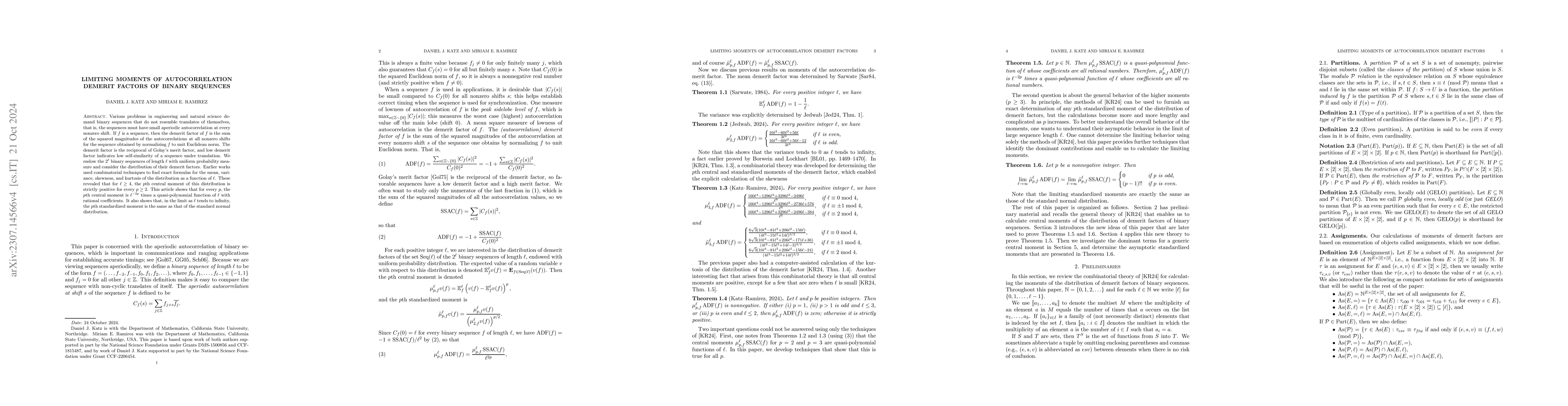 An aperiodic binary sequence of length $\ell$ is a doubly infinite sequence $f=\ldots,f_{-1},f_0,f_1,\ldots$ with $f_j \in \{-1,1\}$ when $0 \leq j < \ell$ and and $f_j=0$ otherwise. Various problems in engineering and natural science demand binary sequences that do not resemble translates of themselves. The autocorrelation of $f$ at shift $s$ is the dot product of $f$ with the sequence obtained by translating $f$ by $s$ places. The demerit factor of $f$ is the sum of the squares of the autocorrelations at all nonzero shifts for the sequence obtained by normalizing $f$ to unit Euclidean norm. Low demerit factor therefore indicates low self-similarity under translation. We endow the $2^\ell$ binary sequences of length $\ell$ with uniform probability measure and consider the distribution of their demerit factors. Earlier works used combinatorial techniques to find exact formulas for the mean, variance, skewness, and kurtosis of the distribution as a function of $\ell$. These revealed that for $\ell \geq 4$, the $p$th central moment of this distribution is strictly positive for every $p \geq 2$. This article shows that every $p$th central moment is a quasi-polynomial function of $\ell$ with rational coefficients divided by $\ell^{2 p}$. It also shows that, in the limit as $\ell$ tends to infinity, the $p$th standardized moment is the same as that of the standard normal distribution.