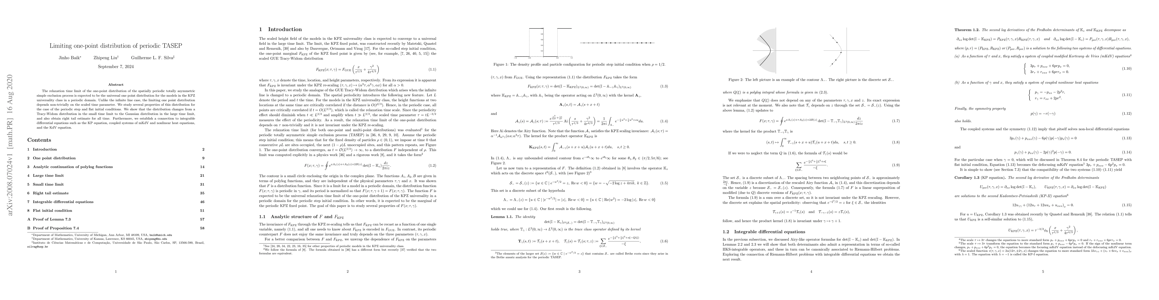 The relaxation time limit of the one-point distribution of the spatially periodic totally asymmetric simple exclusion process is expected to be the universal one point distribution for the models in the KPZ universality class in a periodic domain. Unlike the infinite line case, the limiting one point distribution depends non-trivially on the scaled time parameter. We study several properties of this distribution for the case of the periodic step and flat initial conditions. We show that the distribution changes from a Tracy-Widom distribution in the small time limit to the Gaussian distribution in the large time limit, and also obtain right tail estimate for all time. Furthermore, we establish a connection to integrable differential equations such as the KP equation, coupled systems of mKdV and nonlinear heat equations, and the KdV equation.