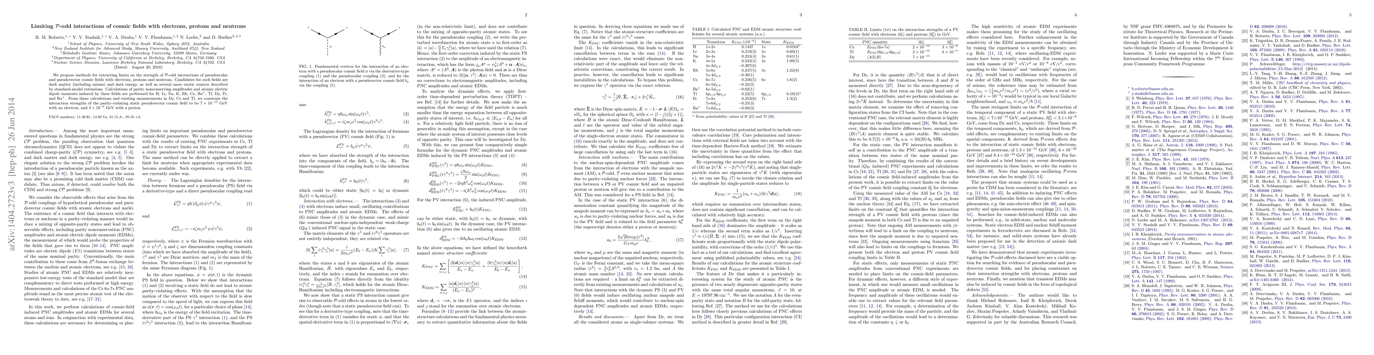 We propose methods for extracting limits on the strength of P-odd interactions of pseudoscalar and pseudovector cosmic fields with electrons, protons and neutrons. Candidates for such fields are dark matter (including axions) and dark energy, as well as several more exotic sources described by standard-model extensions. Calculations of parity nonconserving amplitudes and atomic electric dipole moments induced by these fields are performed for H, Li, Na, K, Rb, Cs, Ba+, Tl, Dy, Fr, and Ra+. From these calculations and existing measurements in Dy, Cs and Tl, we constrain the interaction strengths of the parity-violating static pseudovector cosmic field to be 7*10^(-15) GeV with an electron, and 3*10^(-8) GeV with a proton.